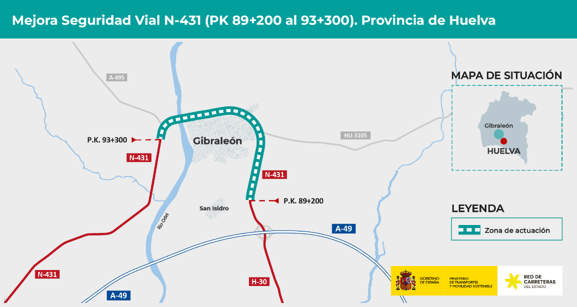 El Ministerio de Transportes y Movilidad Sostenible ha aprobado el expediente de información pública y definitivamente el proyecto de trazado para mejorar la seguridad vial en la N-431, entre los kilómetros 89,2 al 93,3, en el término municipal de Gibraleón, provincia de Huelva. El presupuesto estimado de las obras es de 4,76 millones de euros (IVA incluido).
