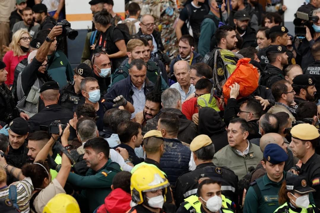 Tanto al rey como al jefe del Consell se les ha visto con manchas de barro en la cara y en la ropa. Se han escuchado gritos de «asesinos», «fuera», «ayuda», «Mazón dimisión», «Pedro Sánchez dimisión» o «dónde está Pedro Sánchez».
