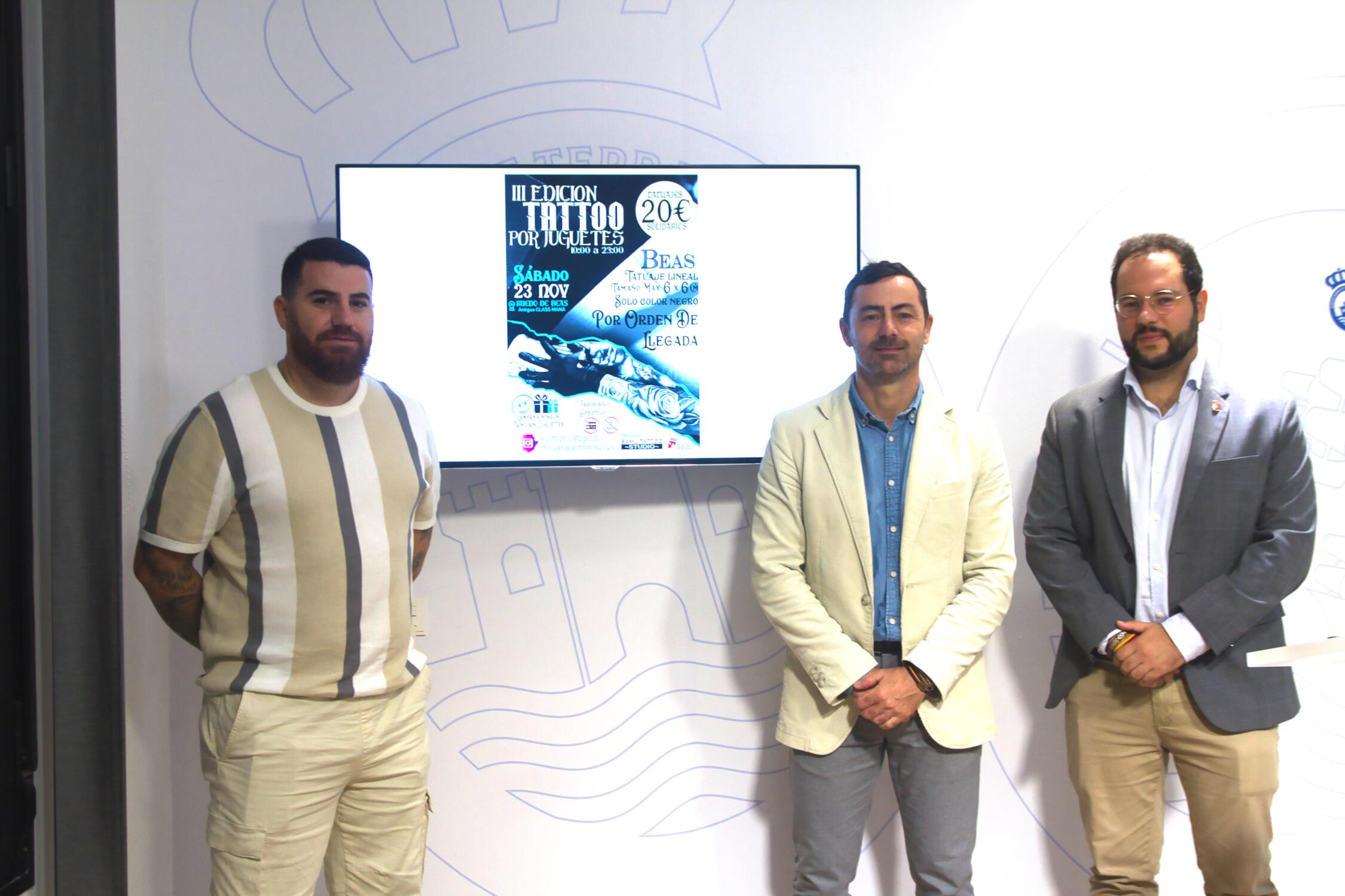 El diputado provincial, Juan Daniel Romero; el alcalde de Beas, José Leñero; y el promotor de la iniciativa y tatuador beasino, Samuel Domínguez, de ‘SamuTattoo Studio’, han presentado esta tercera edición de Tatuajes por juguetes en la que, junto a los tatuadores, también habrá diversas actuaciones musicales. El evento dará comienzo a las diez de la mañana y se alargará hasta las once de la noche aproximadamente. En todo ese tiempo el equipo no parará de hacer tatuajes con el fin de recaudar lo máximo posible que irá destinado íntegramente a los niños sin recursos y hospitalizados de la provincia de Huelva.