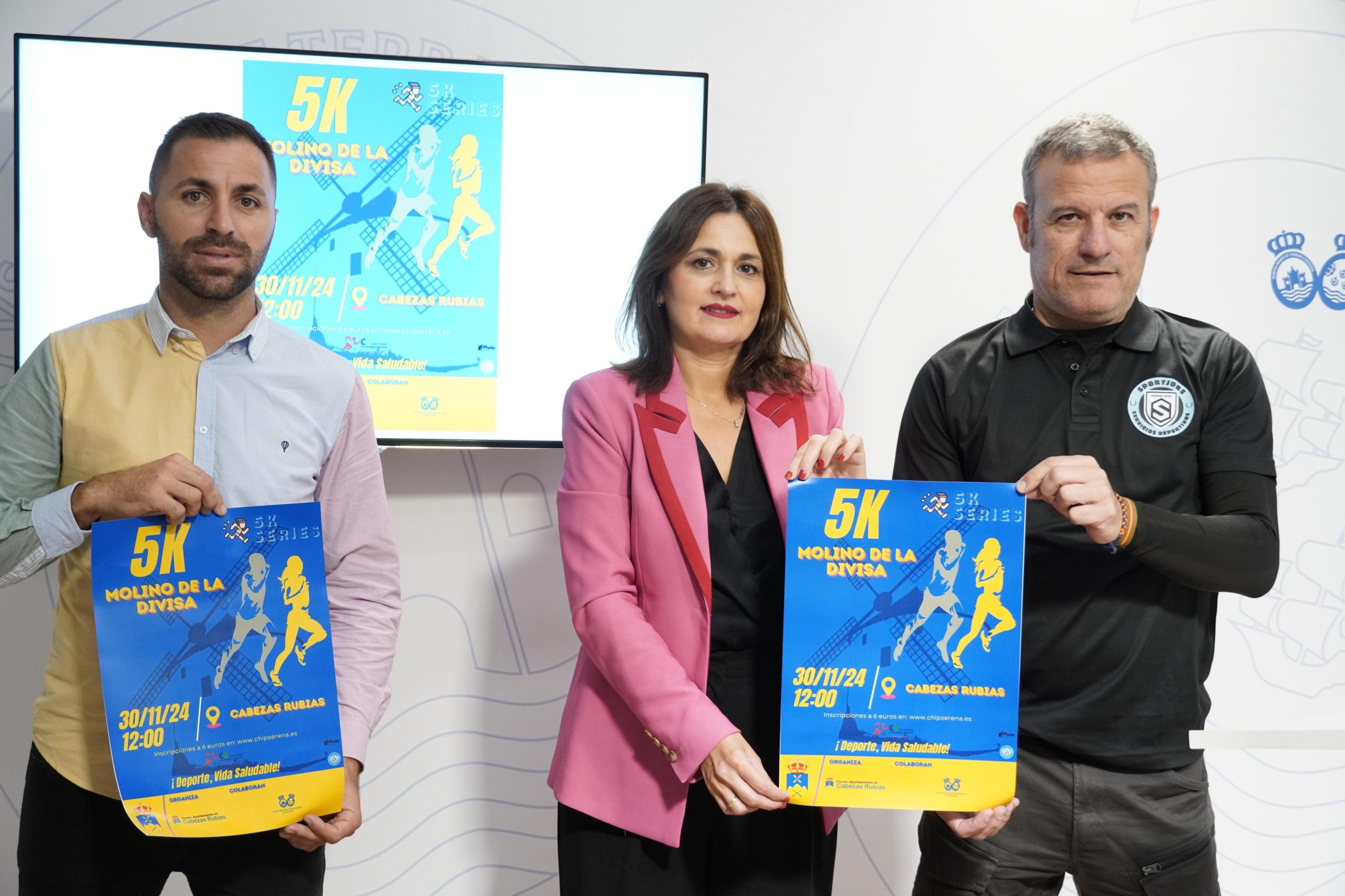 El próximo sábado, 30 de noviembre, Cabezas Rubias acogerá la disputa de la primera edición de la 5K Molino de la Divisa. Una prueba abierta a la participación de todas aquellas personas que tengan cumplidos los 16 años y que esta mañana se ha presentado en la Diputación de Huelva. La diputada provincial, Carmen Díaz, junto con el concejal de Deportes del ayuntamiento de Cabezas Rubias, Rafael Patricio; y el director técnico de la carrera, Emilio Muñoz, han dado a conocer los detalles de esta carrera que tendrá la plaza de España de la localidad como salida y meta de la prueba.