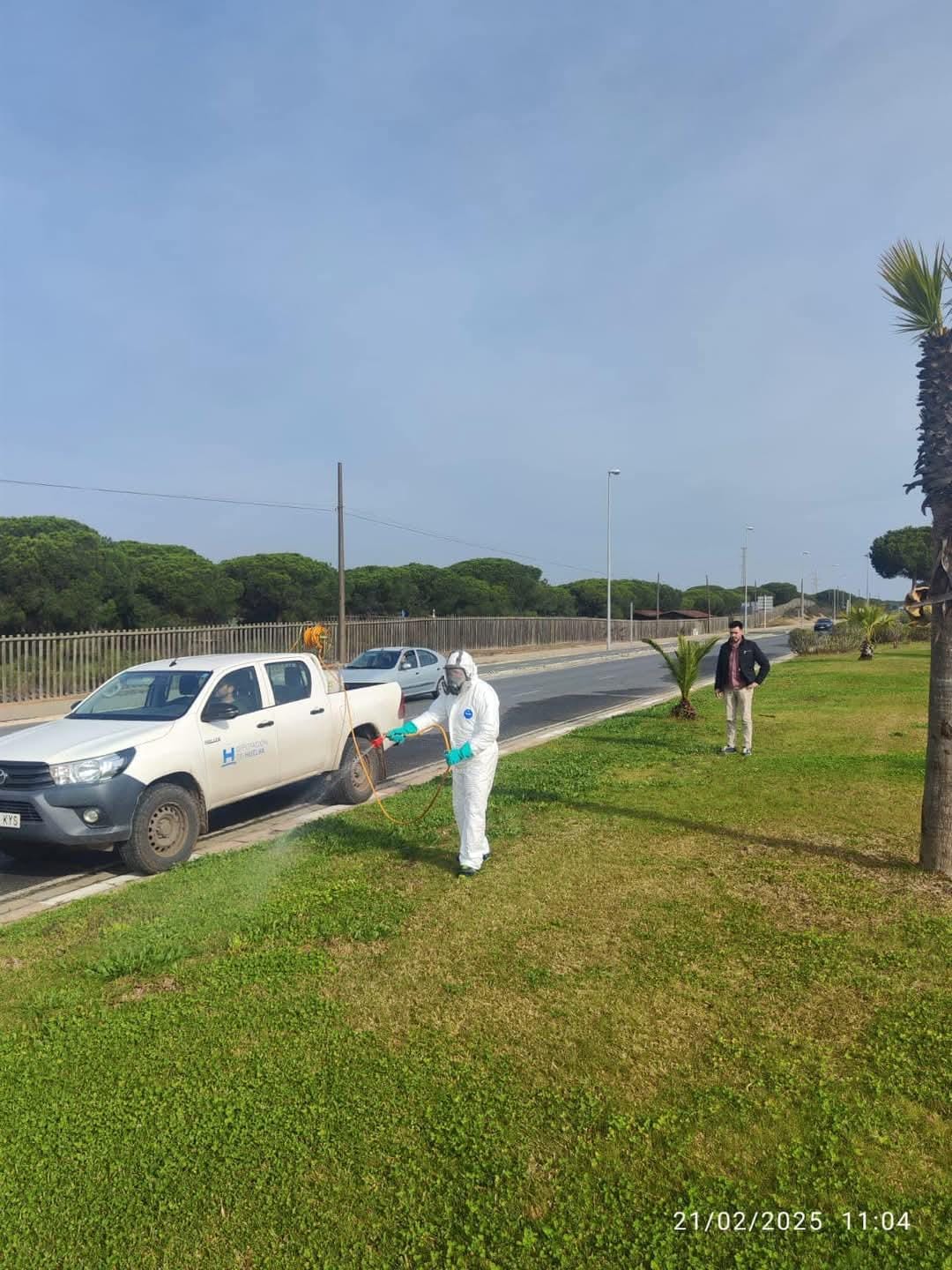 De este modo, el lunes de esta semana se ha estado trabajando en Hinojos, Moguer y Mazagón, mientras que el martes y este mismo miércoles los tratamientos se están aplicando también por Palos de la Frontera y su entorno de La Rábida en dirección a Huelva capital. «Aprovechando el buen tiempo del que disponemos, ya que para el fin de semana se esperan precipitaciones, por lo que se tendrán que interrumpir los tratamientos».