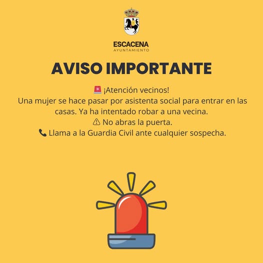 El Ayuntamiento de Escacena del Campo ha emitido un aviso urgente a la ciudadanía tras detectarse la presencia de una mujer que, haciéndose pasar por trabajadora del servicio de ayuda a domicilio, ha intentado acceder a varios domicilios del municipio con fines delictivos.