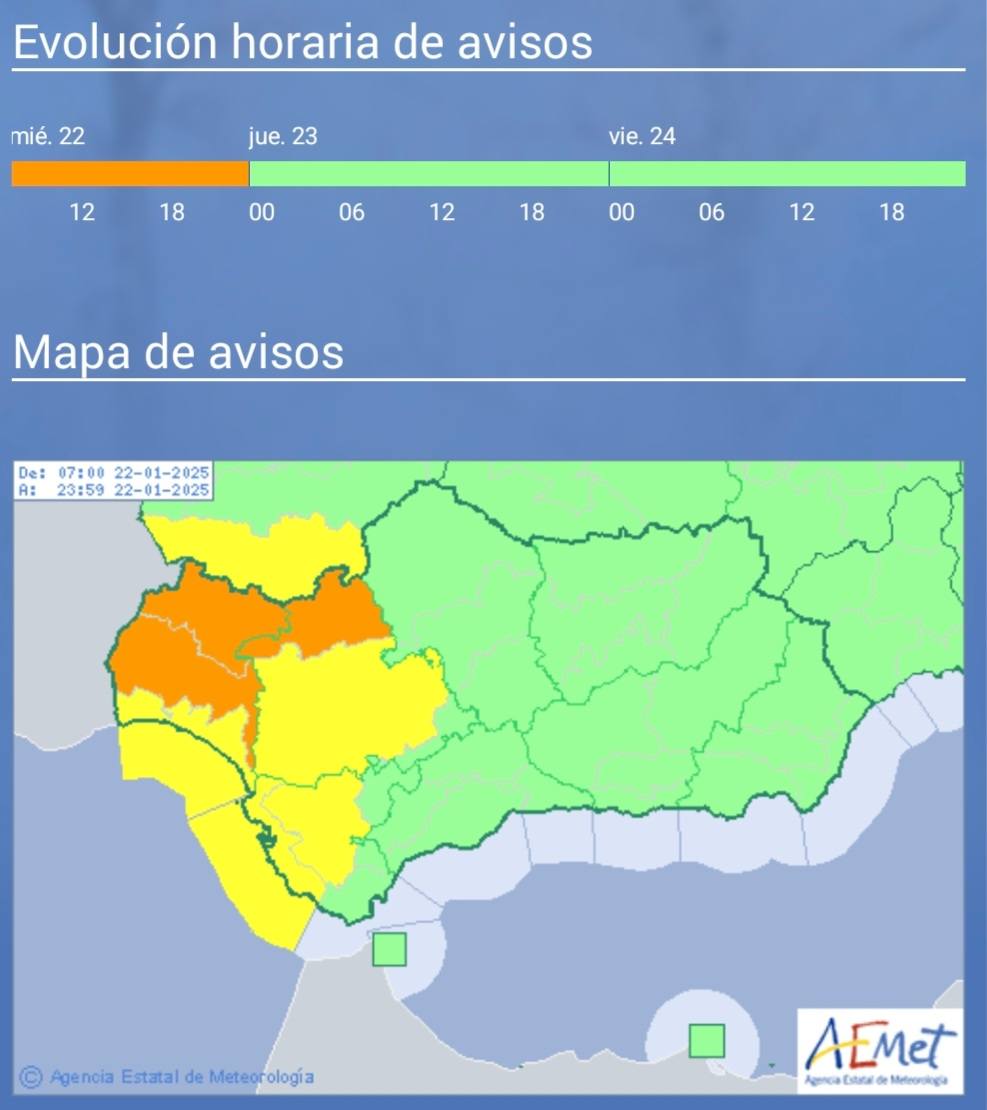 La Agencia Estatal de Meteorología mantiene el aviso naranja por lluvias en Huelva (Aracena, Andévalo y Condado) y en Sevilla (Sierra Norte). Se mantienen los avisos amarillo por lluvias y tormentas en el litoral onubense y gaditano, así como en las campiñas de Cádiz y Sevilla. También hay aviso amarillo por fenómenos costeros en las provincias de Huelva y Cádiz.