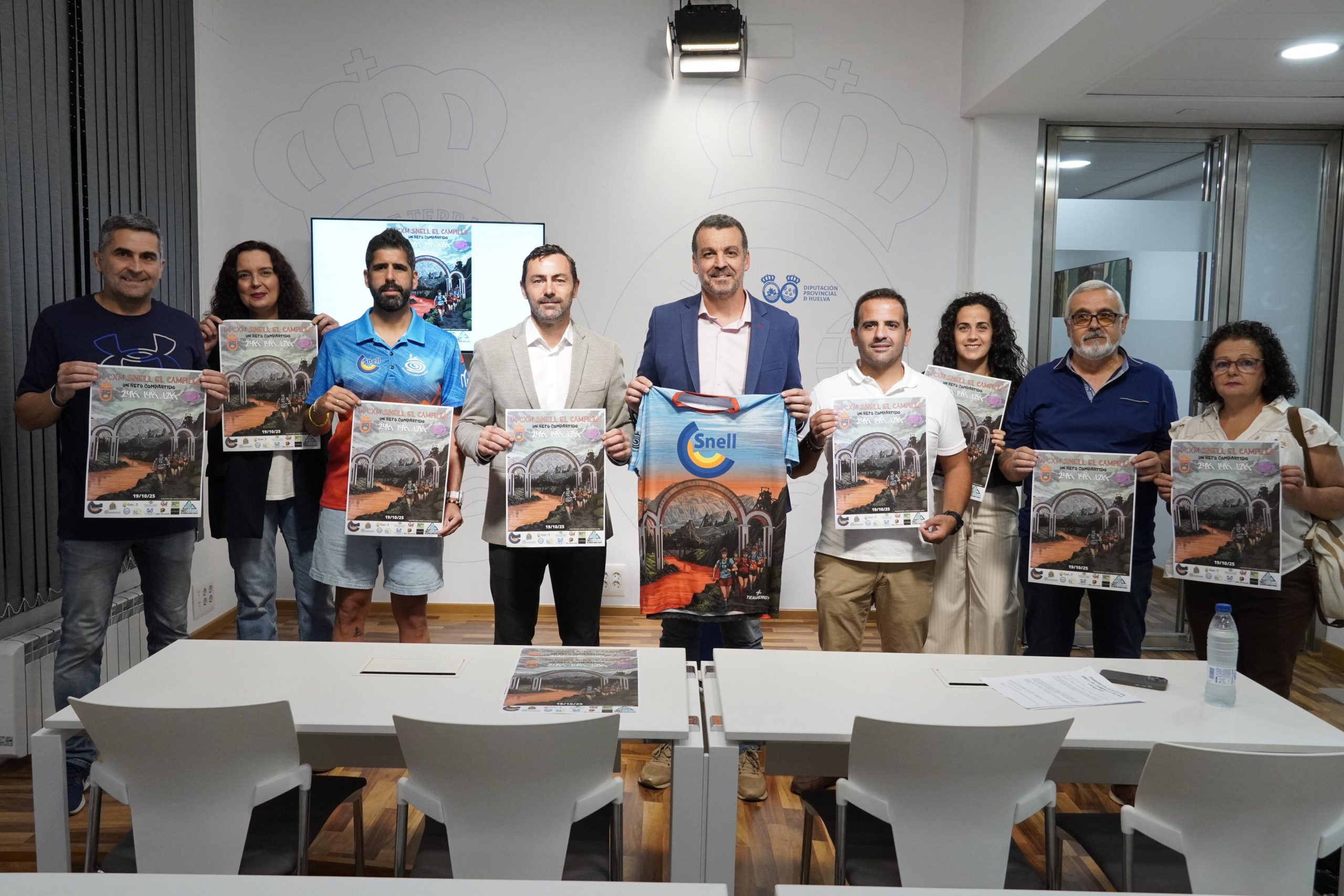 El diputado de Deportes de la Diputación de Huelva, Juan Daniel Romero, junto al alcalde de El Campillo, Juan Carlos Jiménez; la concejala de Deportes, Paloma Viega; el CEO de SNELL Cuenca Minera, Miguel González; el presidente de Runners Cuenca Minera, Francisco Fernández, y representantes de AFA El Campillo y Acamacum, han presentado esta prueba que contará con tres distancias. Una de 14 kilómetros y un desnivel positivo de 400 metros; una segunda, más exigente, de 24 kilómetros con un desnivel positivo de 850 metros, por el campo y senderos; y una tercera, de senderismo y no competitiva con una distancia de 12 kilómetros.
