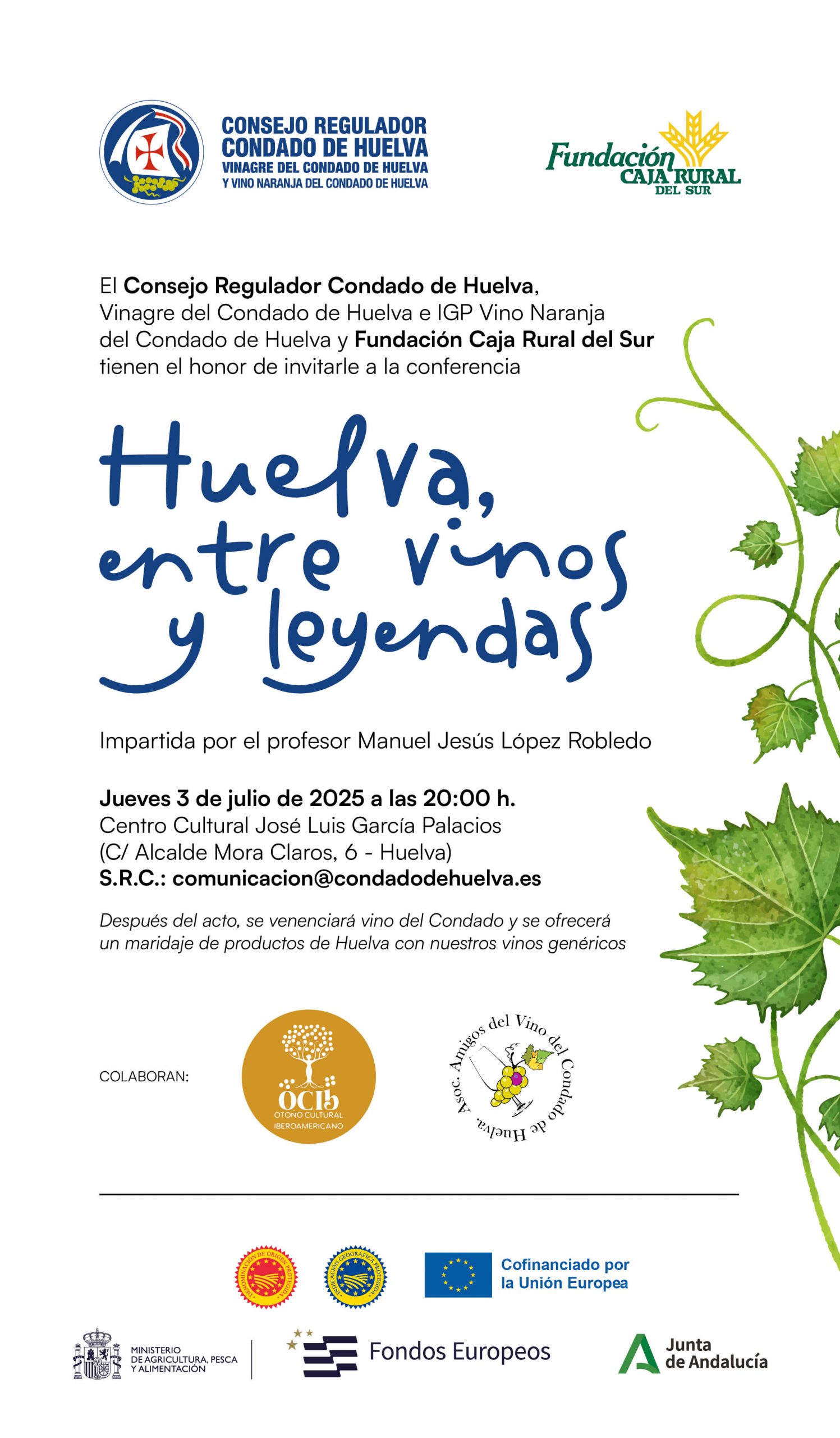 El Consejo Regulador de las Denominaciones de Origen Protegidas Condado de Huelva, Vinagre del Condado de Huelva e IGP Vino Naranja del Condado de Huelva, en colaboración con la Fundación Caja Rural del Sur, organiza mañana jueves 3 de julio, a las 20.00 horas, la conferencia ‘Huelva, entre vinos y leyendas. Un viaje histórico por la cultura del vino onubense’, en la sede de la Fundación en Huelva capital.