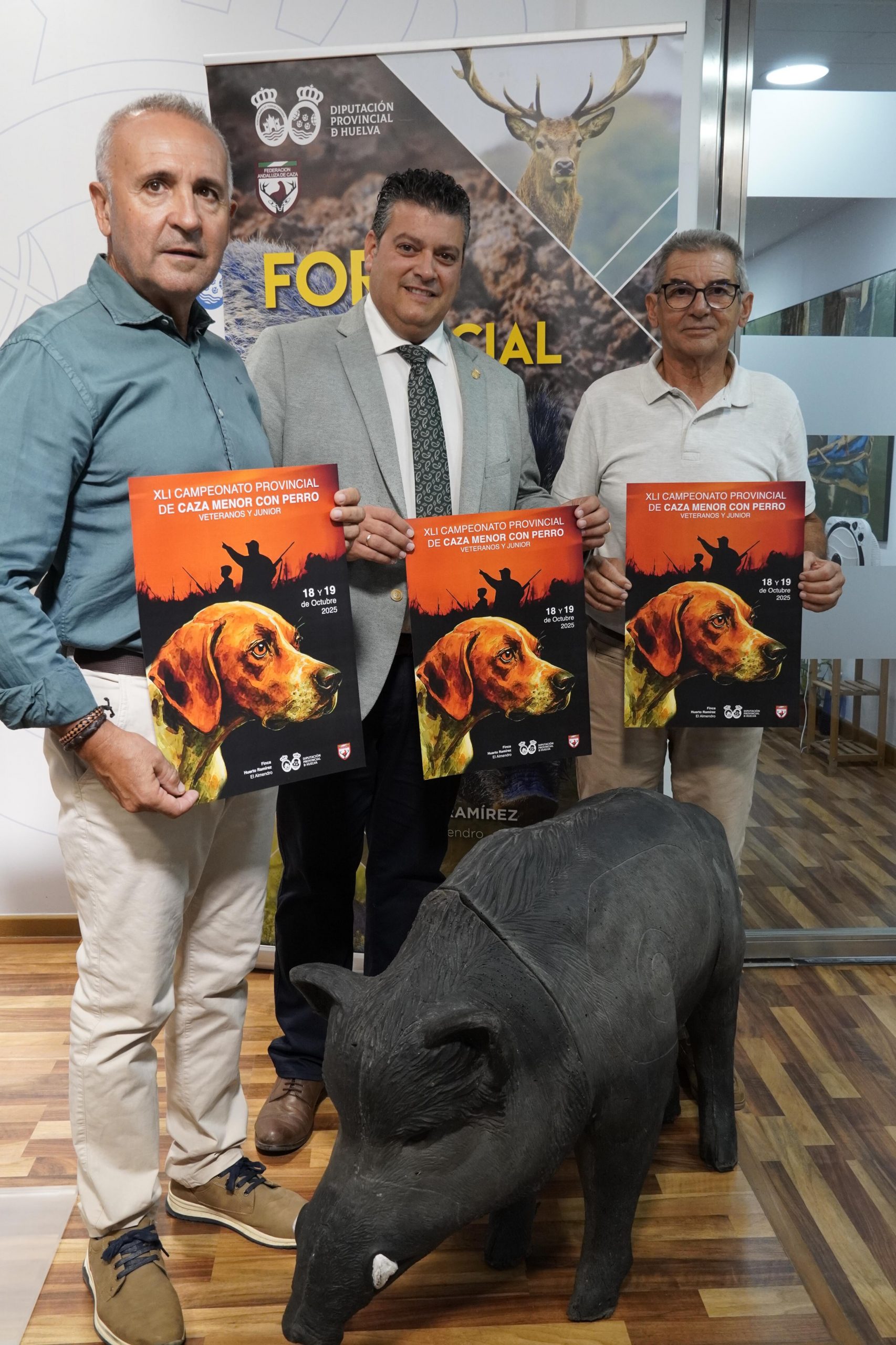 El diputado de Caza, Arturo Alpresa, junto al presidente de la delegación onubense de la Federación, Juan Jesús Sánchez, y el secretario provincial, Francisco Gómez Alejo, han presentado hoy en la sede provincial esta convocatoria, dirigida a cazadores veteranos y júnior de toda la provincia.