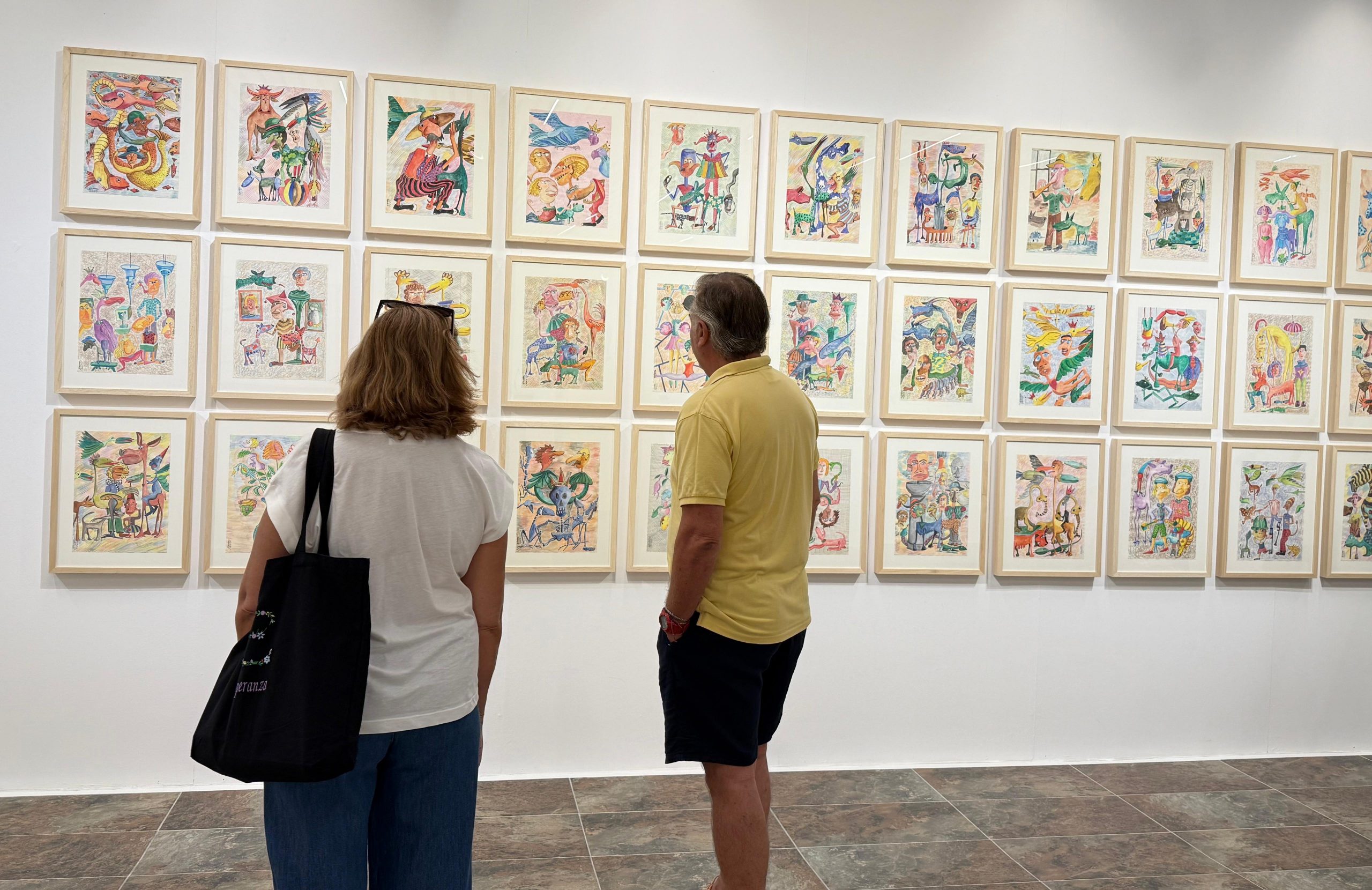 La muestra brinda un recorrido por la fantasía de las formas y las escenas, un acercamiento a su trabajo “surrealista y cotidiano, tierno y bruto, repleto de guiños: a la naturaleza, a lo cotidiano, a lo fieramente humano”. En el mismo papel, apunta Gualda, “puede mezclar un perro con una escalera, una virgen con una peonza, un cactus con una canción, y todo cobra sentido —o mejor dicho, sentido del suyo—. Porque no busca gustar. Busca decir. O más bien, jugar. El suyo es un arte que no pide permiso”.