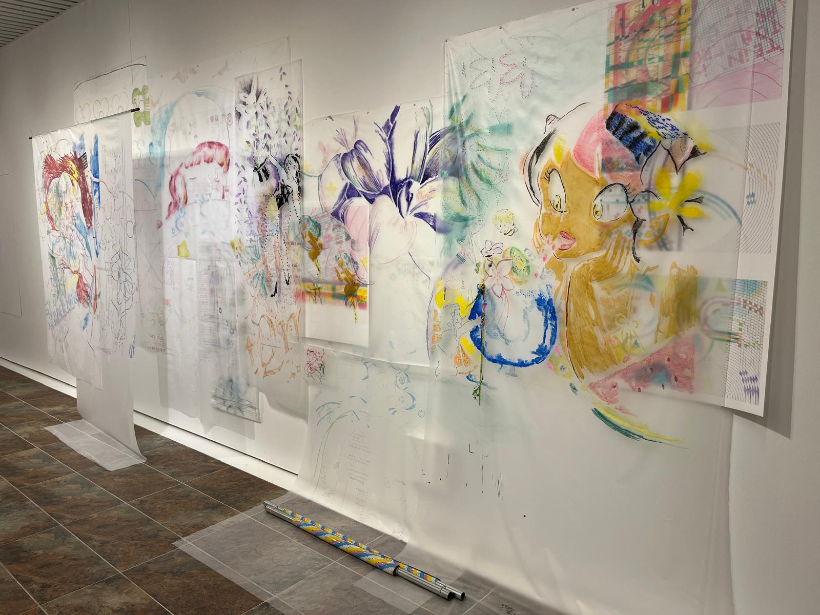 La exposición se organiza en un recorrido en tres momentos que van del deseo a la introspección: “desde imágenes ligadas a la promesa y el brillo del viaje, pasando por obras que evocan el sueño y la acumulación simbólica, hasta llegar a un espacio final de descanso y mediación, con un gran mural en patchwork y un refugio que invita a ser habitado y a detenerse.”