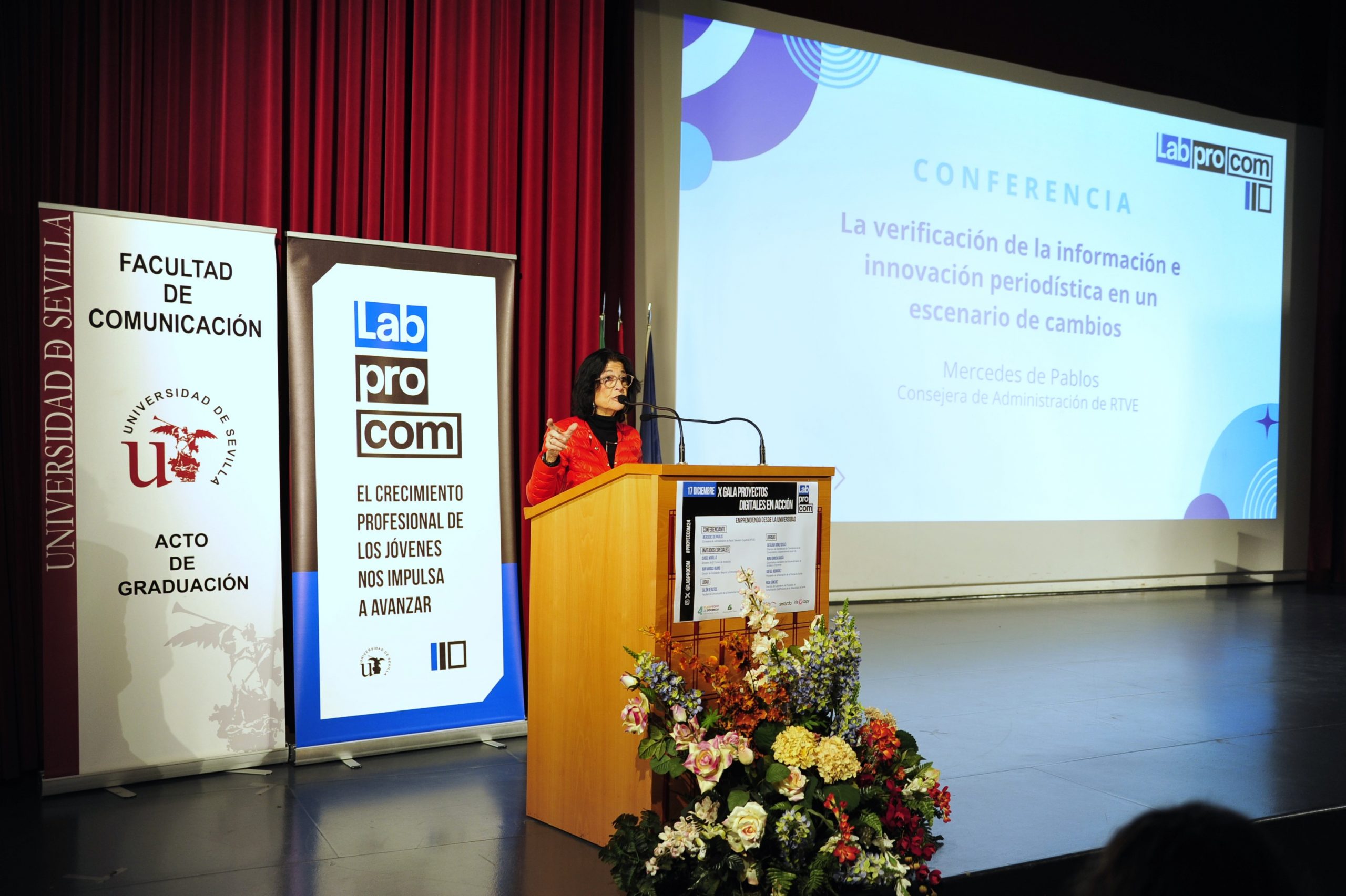 En el ecuador del evento, Mercedes de Pablos, consejera de Administración de RTVE, realizó una intervención para tratar la verificación de la información y la innovación en el ecosistema de los medios de comunicación. De esta manera, tuvo unas palabras en recuerdo de David Beriáin, reportero español asesinado en Burkina Fasso hace unos años. De Pablos comentó que los periodistas “nunca pueden ser la noticia”, pero tampoco deben dejar de lado el “yo” incidiendo en que “la opinión va firmada y la información debe estar contrastada”. Prosiguió hablando de la veracidad cuya consecución por parte de los medios “siempre es posible” con la honestidad como clave.