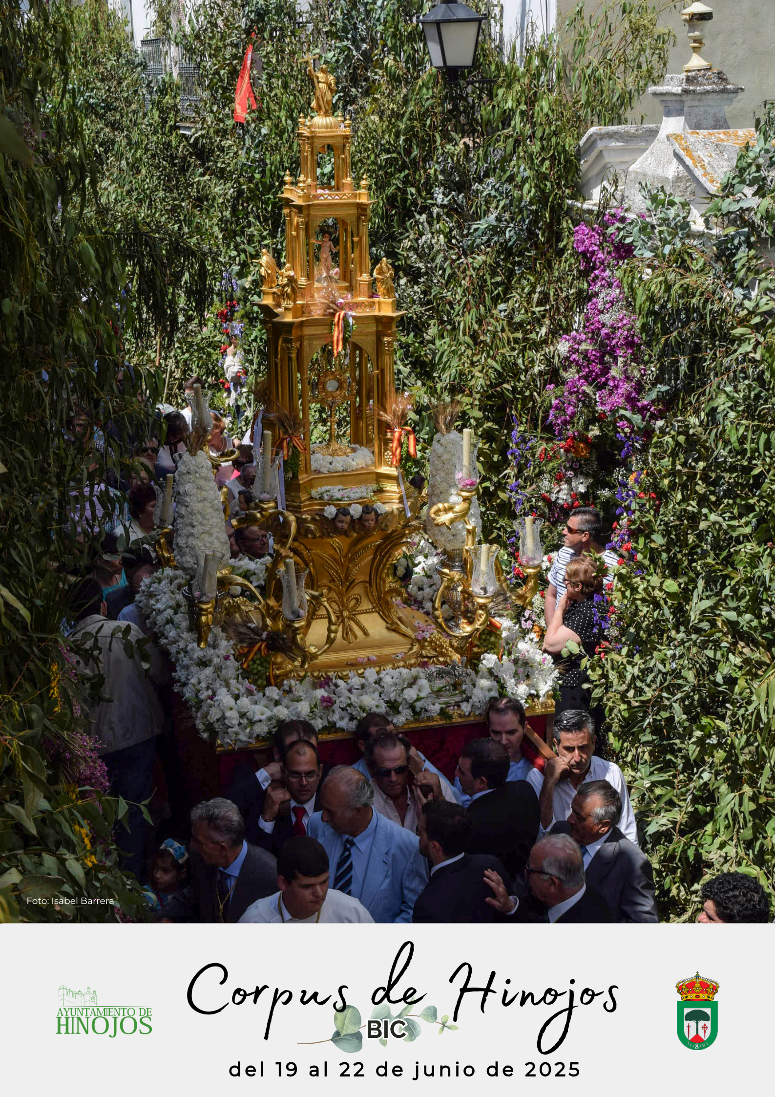 En este contexto, el Ayuntamiento de Hinojos presenta también el cartel oficial del Corpus 2025, una obra fotográfica de la periodista Isabel Barrera, que forma parte del archivo gráfico del Corpus de Hinojos.La imagen seleccionada para esta edición recoge un instante cargado de simbolismo de la procesión del Corpus de 2016, cuando la Custodia aún procesionaba a hombros de hermanos y devotos, según la tradición centenaria de nuestro pueblo. A partir de 2018, coincidiendo con la declaración BIC, el Santísimo comenzó a procesionar sobre andas llevadas por costaleros, iniciando así una nueva etapa en la Hermandad Sacramental.