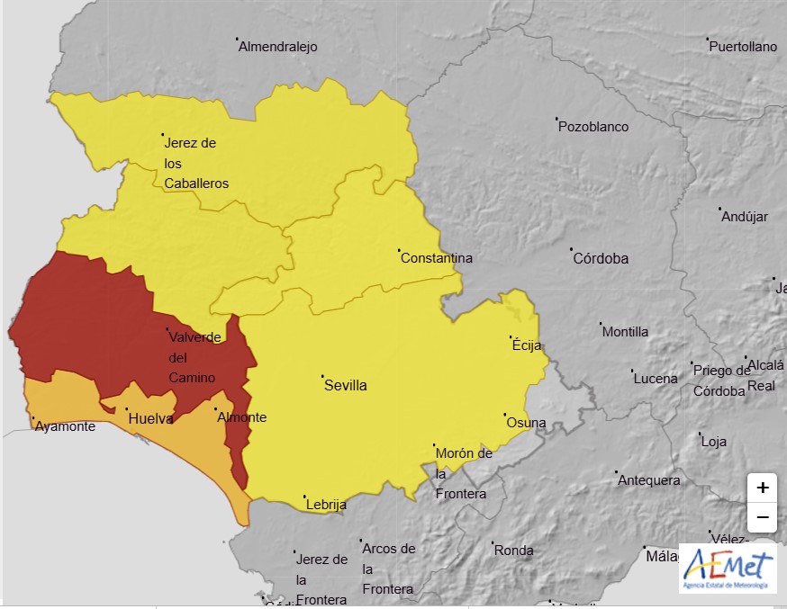 La Agencia Estatal de Meteorología amplía el aviso rojo a parte de la provincia por lluvias, y al resto de la provincia de Huelva se mantiene en alerta naranja hasta la medianoche del miércoles, con una precipitación acumulada de 90 litros por metro cuadrado en doce horas. Por otro lado, la Aemet mantiene activado mañana el aviso amarillo por lluvias en las comarcas sevillanas de la Sierra Norte y la Campiña.