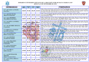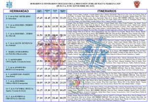 Itinerario: Templo, Virgen de la Esperanza, Plaza Niña, Santa María, Alfonso XII, La Paz, Rábida, Avenida de Italia, Rico, Espronceda, Plaza de las Monjas, RECORRIDO OFICIAL, Plaza del Punto, Berdigón, Alonso Sánchez, Plaza Niña, San Cristóbal, Alfonso XII, Virgen de la Esperanza y Templo.