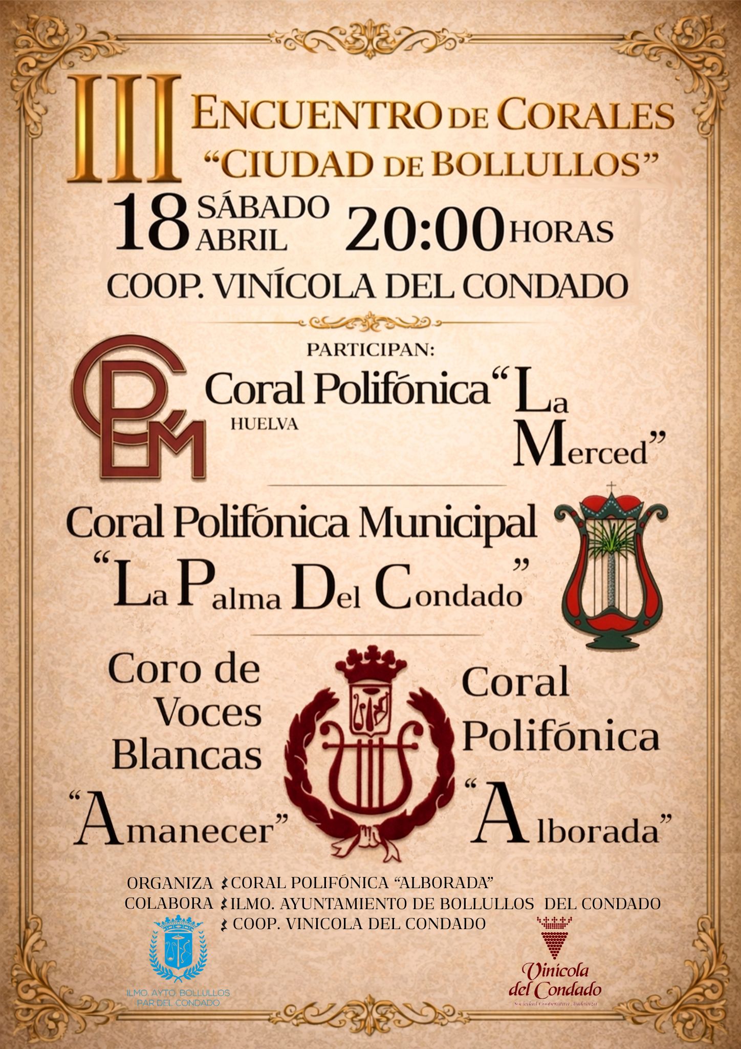 Bollullos Par del Condado acoge este sábado 18 de abril a las 20,00 horas el III Encuentro de Corales ‘Ciudad de Bollullos’, una cita que reunirá a «destacadas» formaciones corales en un enclave «tan singular» como la Cooperativa Vinícola del Condado. El evento esta organizado por la Coral Polifónica ‘Alborada’, que cuenta con la colaboración del Consistorio y la propia cooperativa vinícola, tiene como objetivo «fomentar la música coral y el intercambio cultural entre agrupaciones de diferentes puntos de la provincia».