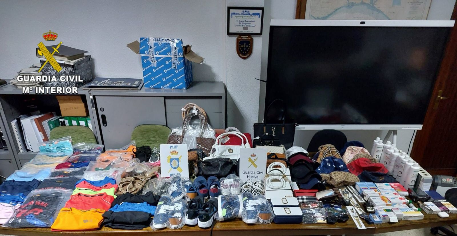 La Guardia Civil ha intervenido diferentes prendas y artículos falsificados, los cuales se encontraban en el interior de un vehículo que iba a desembarcar del Ferry procedente de las Islas Canarias.