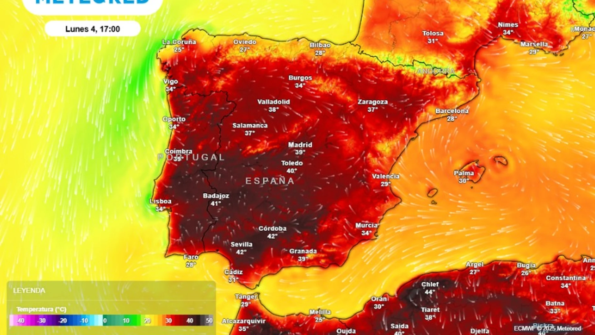 Durante esta jornada los valores cercanos a 40 grados se registrarán de nuevo en torno a las principales depresiones de la mitad sur peninsular, extendiéndose también a la cuenca baja del Miño, siendo muy probable que se superen los 42 grados centígrados en el entorno del Guadiana y el Guadalquivir.