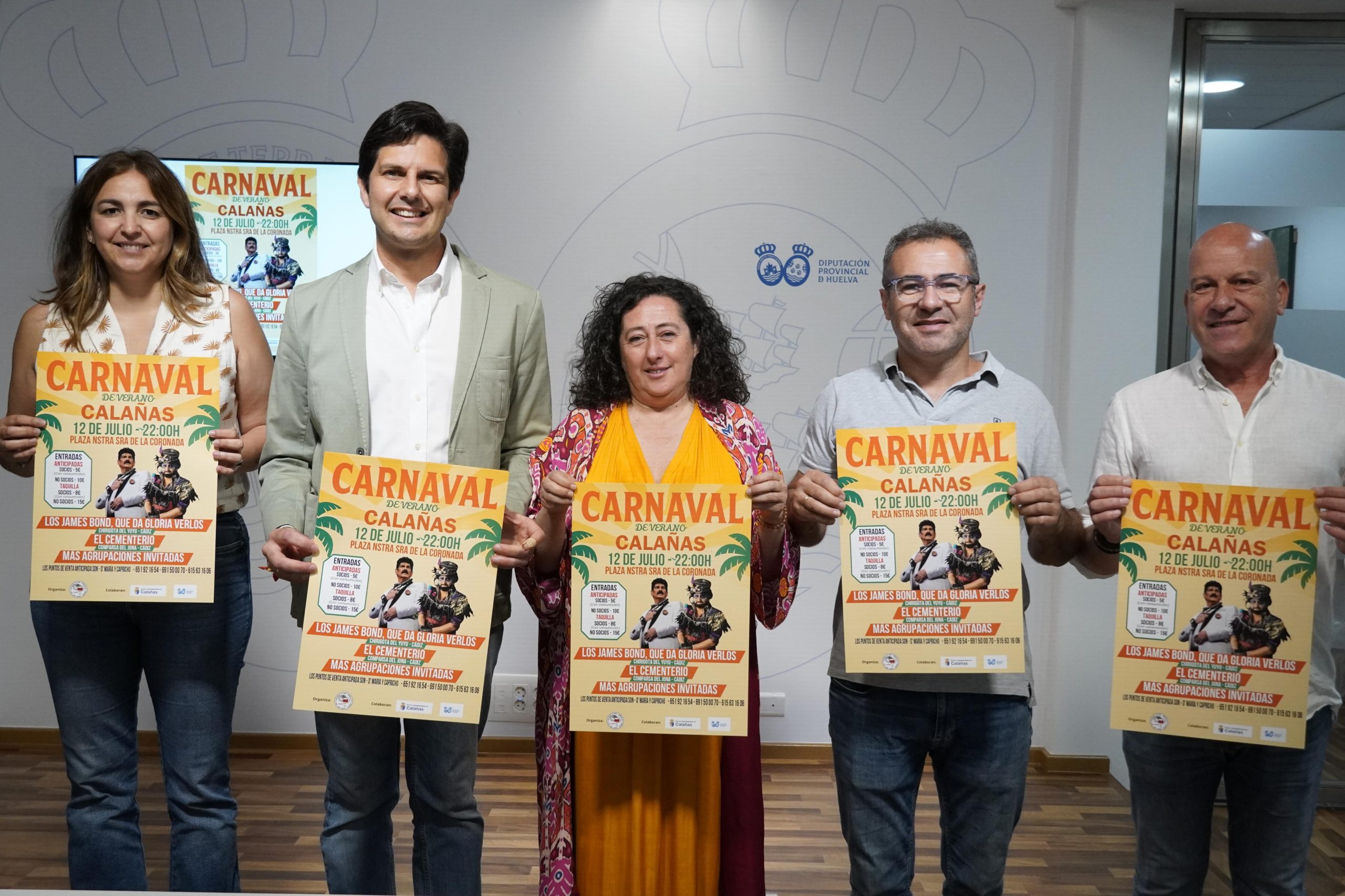 La diputada provincial, Mª del Mar Martín Florido; el alcalde de Calañas, Diego Carrasco; y el presidente de la Asociación Cultural Carnavalesca de Calañas ‘Don Juan Manuel Serrano’, Vicente Casto, han presentado el cartel de este Carnaval de Verano de Calañas, que alcanza este año su cuarta edición