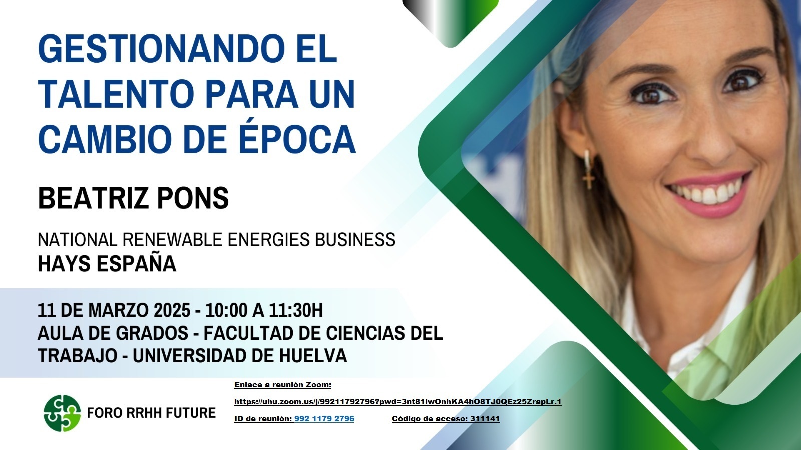 Con el objetivo de crear un espacio en el que abordar y analizar las transformaciones del mercado laboral actual y ayudar a las organizaciones a adaptarse a la nueva realidad en la que nos encontramos, la Facultad de Ciencias del Trabajo pone en marcha el denominado FORO RRHH FUTURE, que comenzará mañana martes, 11 de marzo, con la intervención de Beatriz Pons, directora de Negocio para la Industria Energética en Hays España.