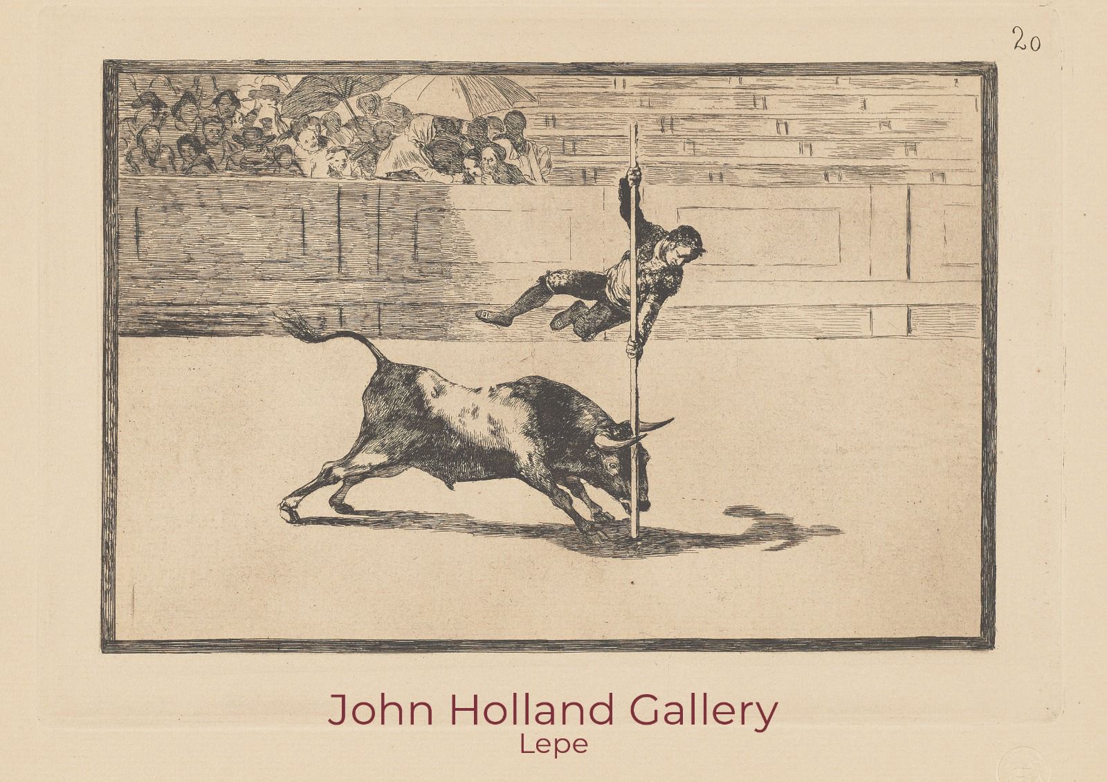 La galería Jonh Holland de Lepe acoge desde ayer y hasta el 5 de abril la exposición ‘La Tauromaquia’, que muestra una serie de grabados realizados por Francisco de Goya en el año 1816. La muestra, coorganizada por la Diputación de Huelva y la galería de Arte Contemporáneo La Aurora, presenta una colección de obras con técnica mixta de agua fuerte, punta seca, bruñidor y agua tinta, que fueron estampadas por el Círculo de Bellas Artes en 1921; incluyendo un retrato de Goya grabado por J. Pedrosa Ostos.