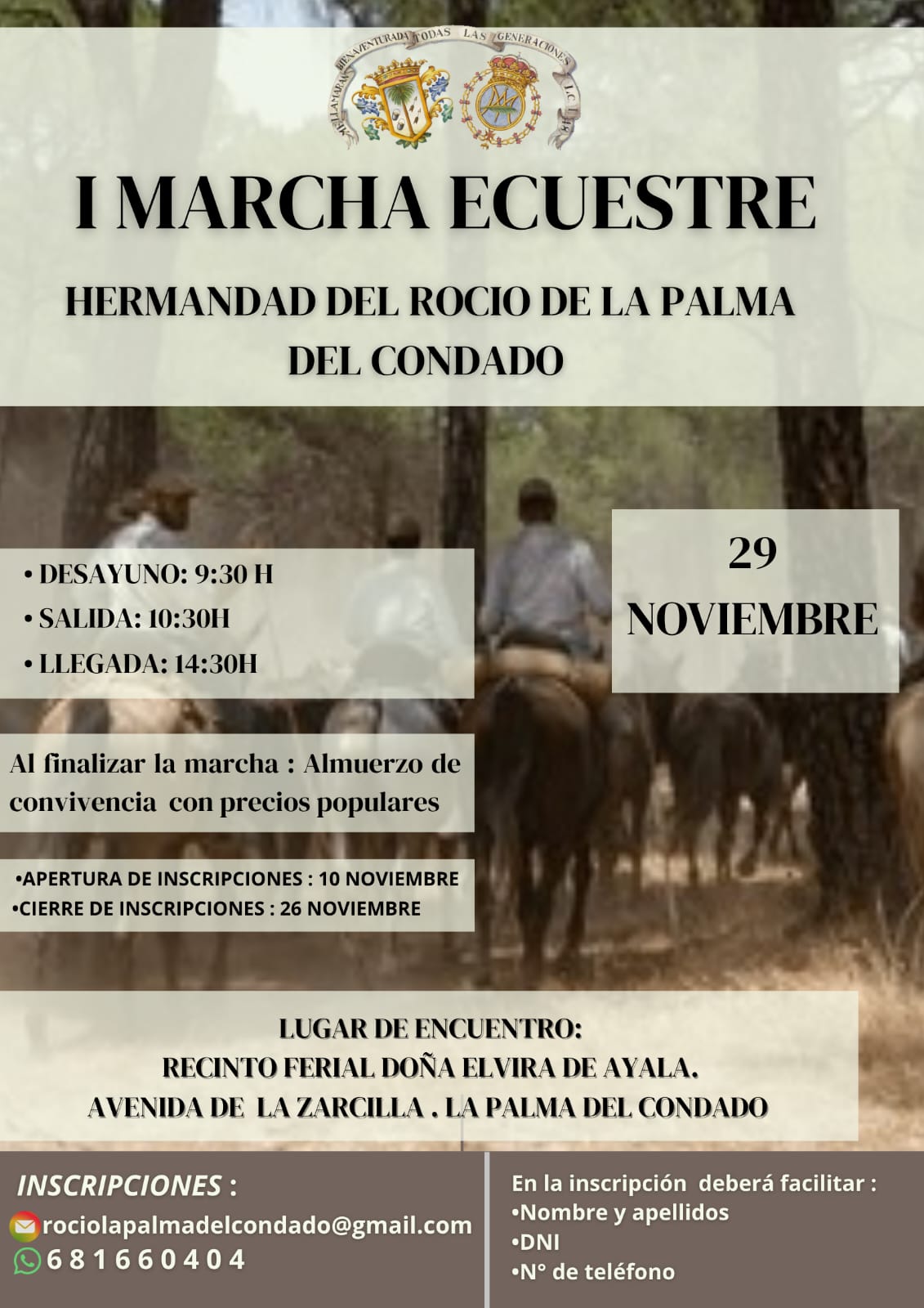 La Palma del Condado se prepara para disfrutar de una jornada muy especial el próximo 29 de noviembre con la celebración de la I Marcha Ecuestre, una iniciativa organizada por la Hermandad del Rocío del municipio que busca fomentar la convivencia y poner en valor los parajes naturales que rodean la localidad.