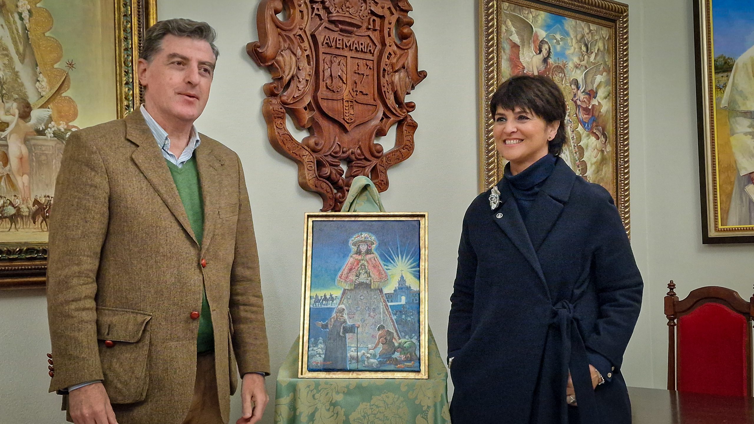La Hermandad Matriz de Almonte ha presentado este jueves la obra que ilustrará su felicitación navideña, realizada por la pintora Nuria Barrera. Este trabajo, cargado de simbolismo y sensibilidad, muestra a la Virgen del Rocío vestida de Pastora bajo la luz de la estrella de Belén, rodeada de pastores y rebaños que evocan el cuidado y la protección divina. Enmarcada en el Nacimiento, la pintura refleja el profundo vínculo entre la fe rociera y el misterio de la Navidad. La institución rociera ha presentado también una extensa programación navideña.