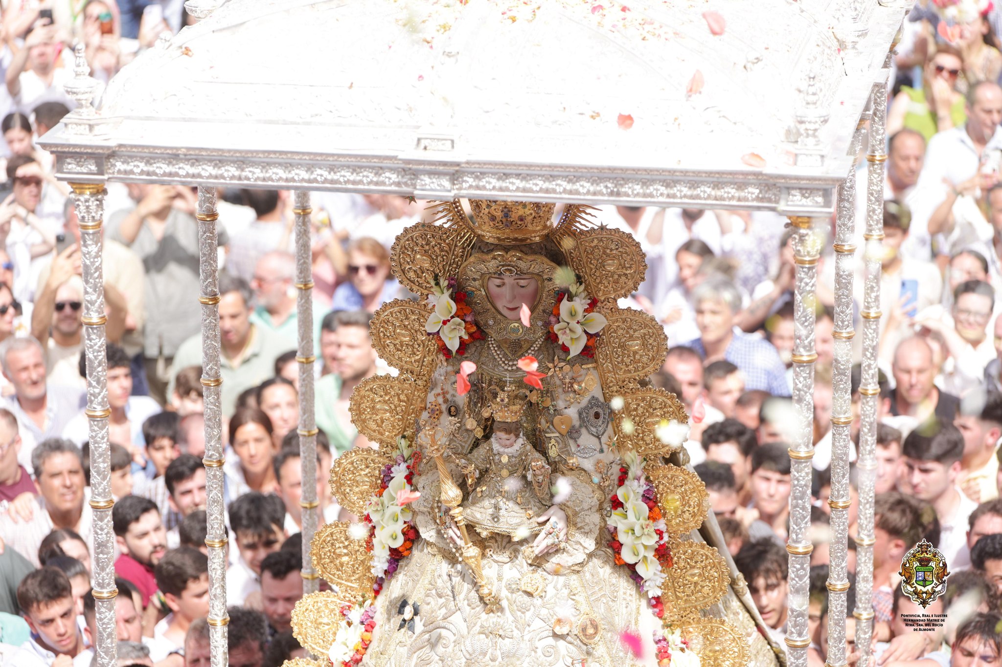 El momento más esperado, la procesión de la Patrona de Almonte, comenzó a las 02:42 horas de la madrugada del Lunes de Pentecostés y concluyó a las 12:32 horas del mediodía, con un recorrido que se prolongó durante más de nueve horas. Este año, se ampliaba unos metros el recorrido a la altura de la Plaza de Doñana, lo que permitió una mejor distribución de los simpecados y facilitó la fluidez y el desarrollo de la procesión de la Virgen, llevada a hombros por los almonteños.