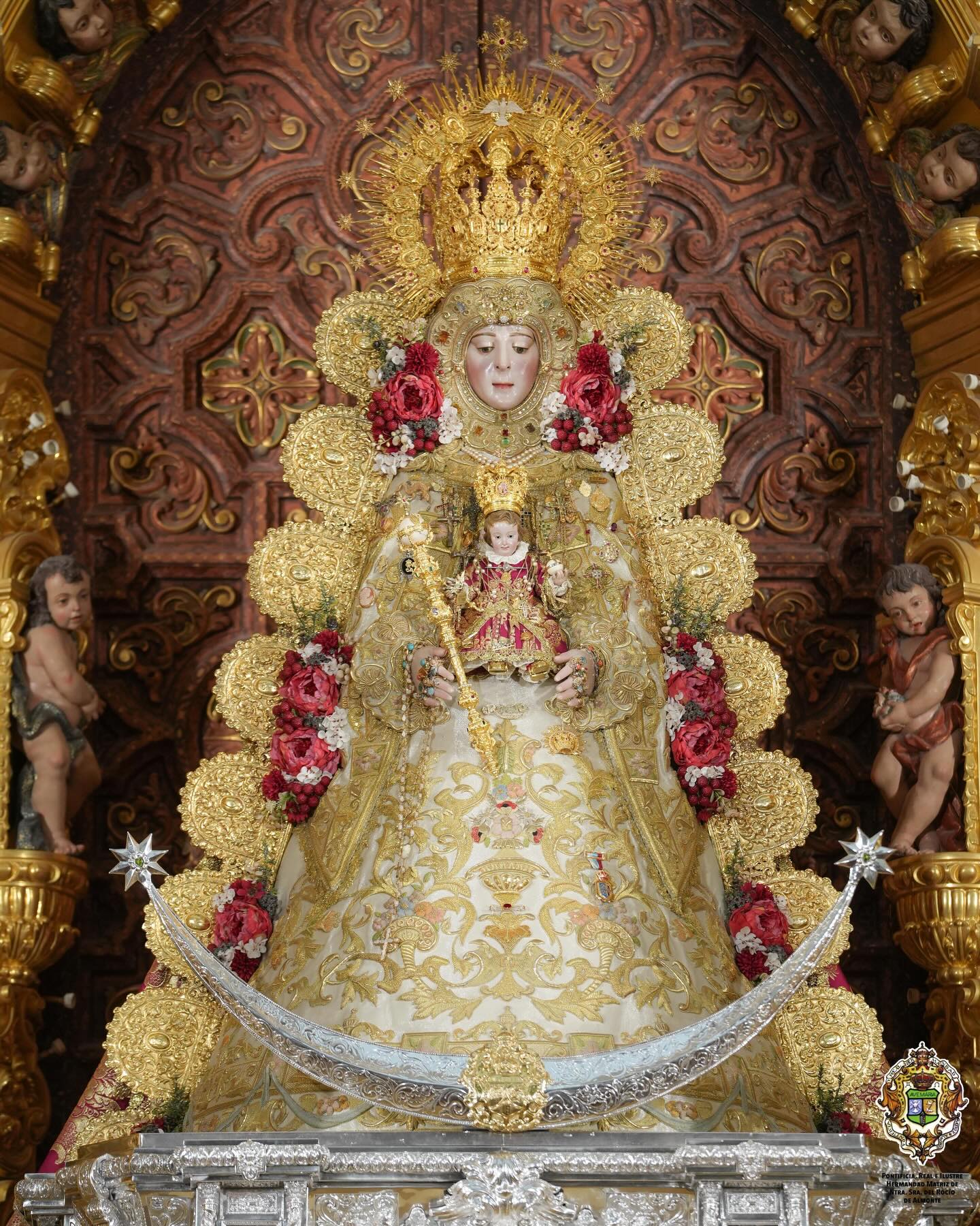 A las puertas del día de Navidad, la Virgen luce un cuidado y simbólico exorno que invita a vivir estas fechas con fe, emoción y esperanza. En esta ocasión, porta la corona del Centenario de la Coronación, obsequio de las Hermandades, junto a la corona del Niño, estrenada por la Virgen en el año 2019.