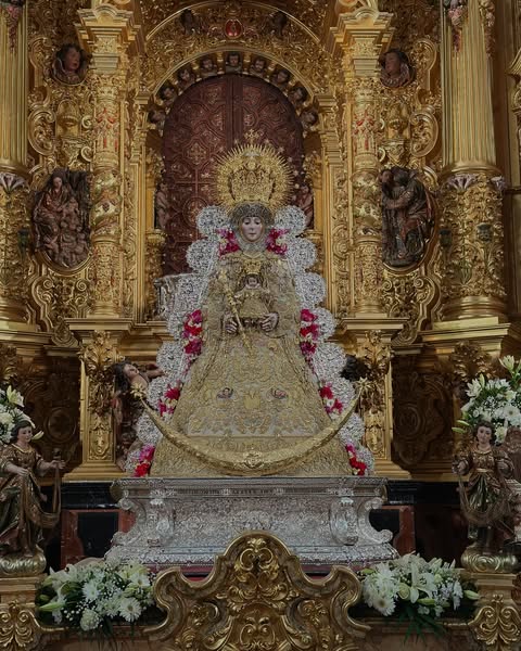 La Virgen ha amanecido hoy entronizada en la peana de su paso para conmemorar la Fiesta de la Luz, celebración enmarcada dentro del Jubileo 2025. En esta ocasión, luce el traje conocido como «de Pentecostés», confeccionado en 2011 en los prestigiosos talleres sevillanos de Santa Bárbara. Este terno incluye el traje a juego para el Pastorcito, aportando una armonía estética a la imagen.