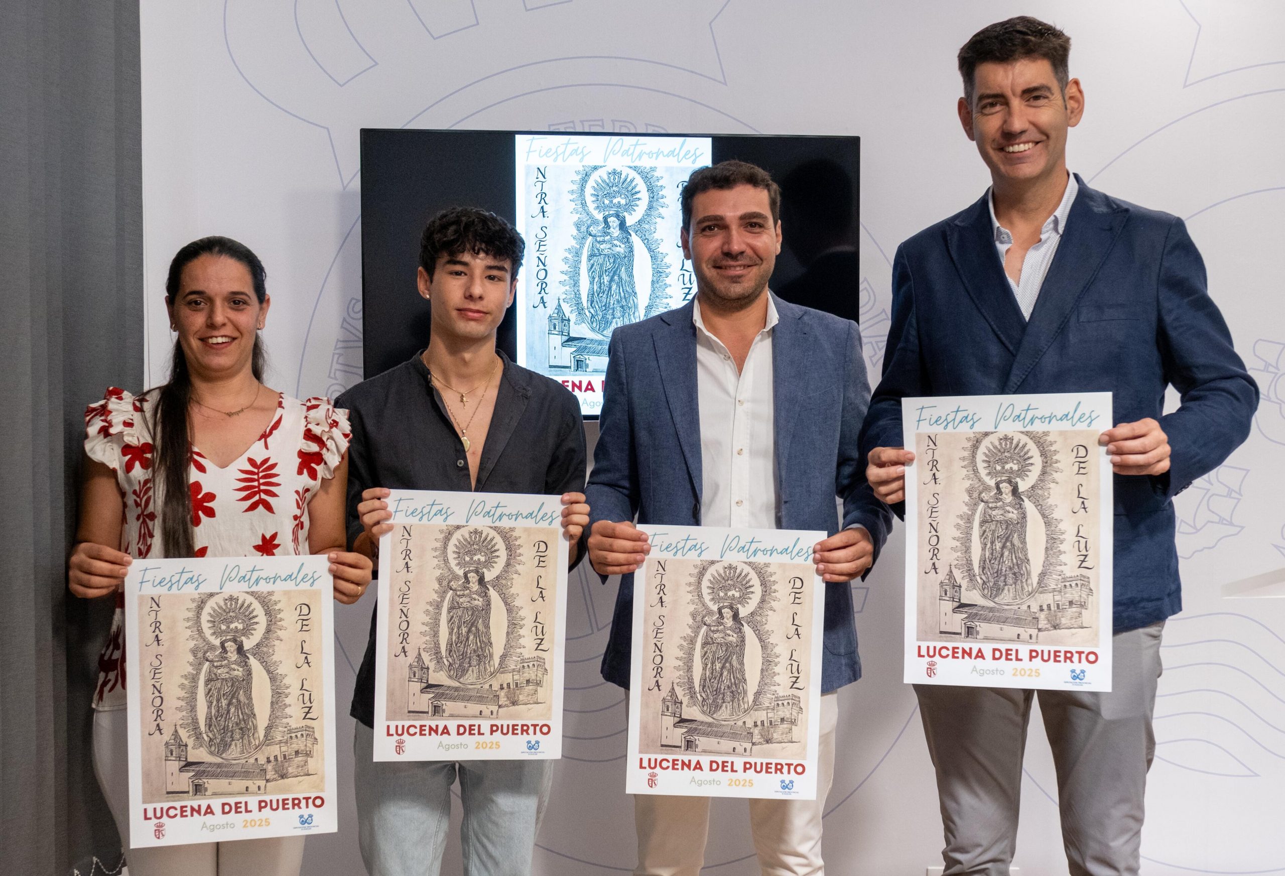 El diputado provincial, Manuel Cayuela; el alcalde de la localidad, Álvaro Regidor, Almudena Hernández, concejal de festejos y Antonio Barroso, autor del cartel anunciador de las fiestas, han presentado la programación que incluye la salida procesional de Nuestra Señora de la Luz, el próximo 15 de agosto por las calles de la localidad.
