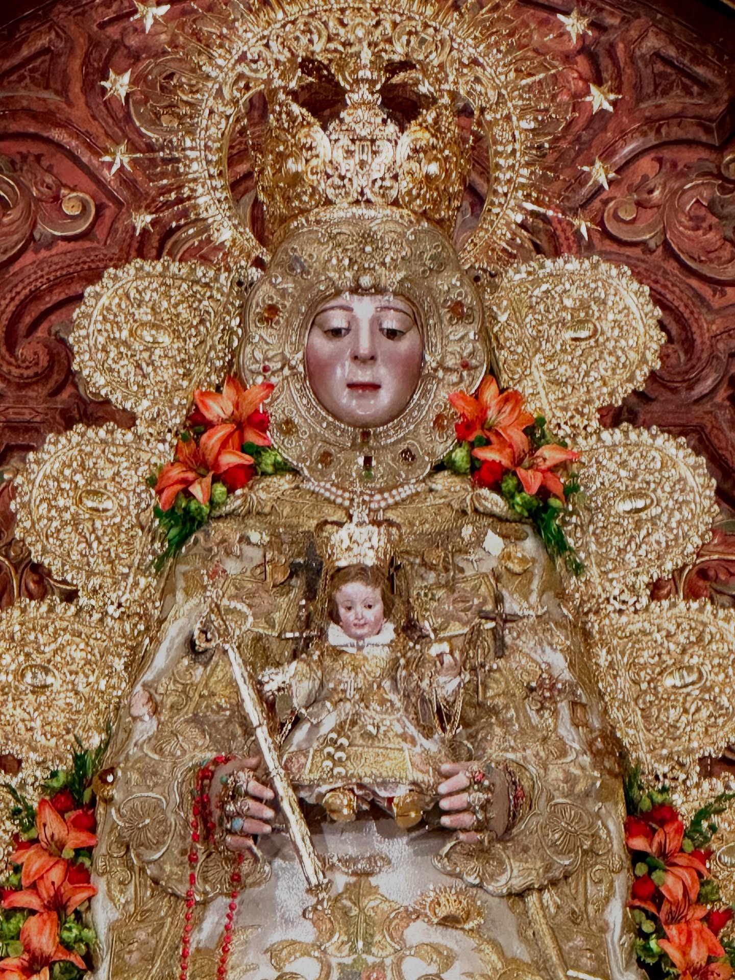 La Virgen del Rocío ha regresado a su camarín tras la Romería del Rocío, y un mes después de Pentecostés, vestida con el tradicional terno de las mujeres de Almonte, uno de los más representativos y queridos por los devotos. Este atuendo, lleno de significado, está acompañado del histórico manto de Pentecostés, testigo de incontables promesas, plegarias y emociones a lo largo de los años.