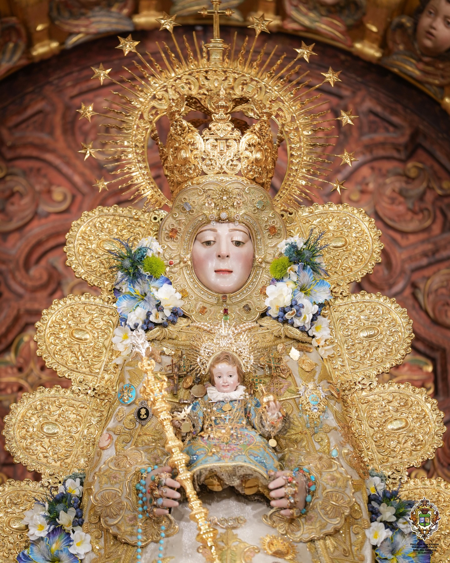 La Virgen completa su atuendo con la toca de Santa Bárbara y el rostrillo conocido como “de los topacios”, elementos tradicionales del ajuar mariano.