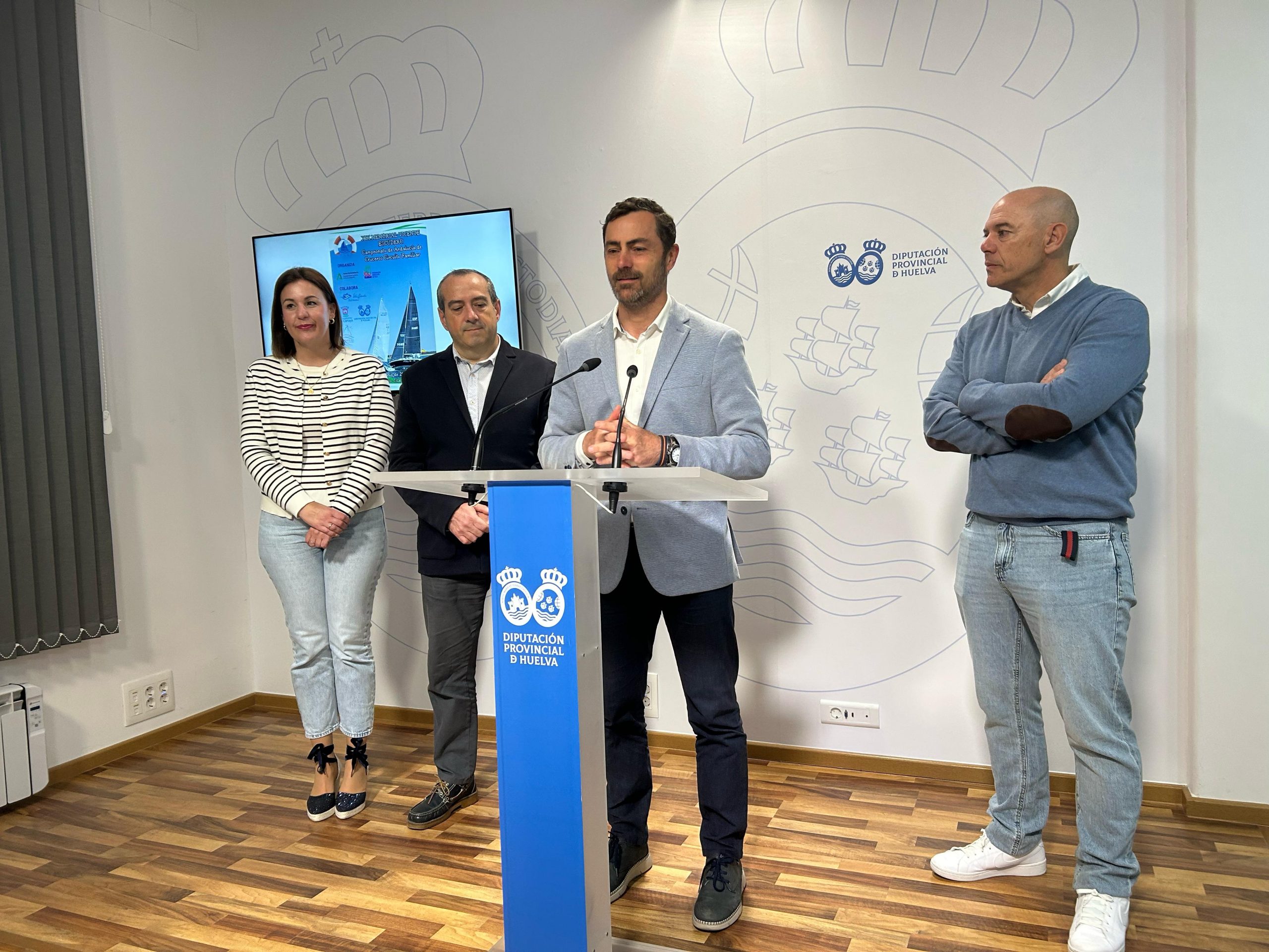 El diputado de Deportes, Juan Daniel Romero; la primera teniente de alcalde de Cartaya, Eva Moya, así como Francisco Pérez e Isaac Quiles, del Club Náutico Río Piedras, han presentado esta mañana, en la Diputación de Huelva, este ‘Memorial Vicente Escudero’, con el que se abrirá el calendario de regatas de verano de la provincia de Huelva.