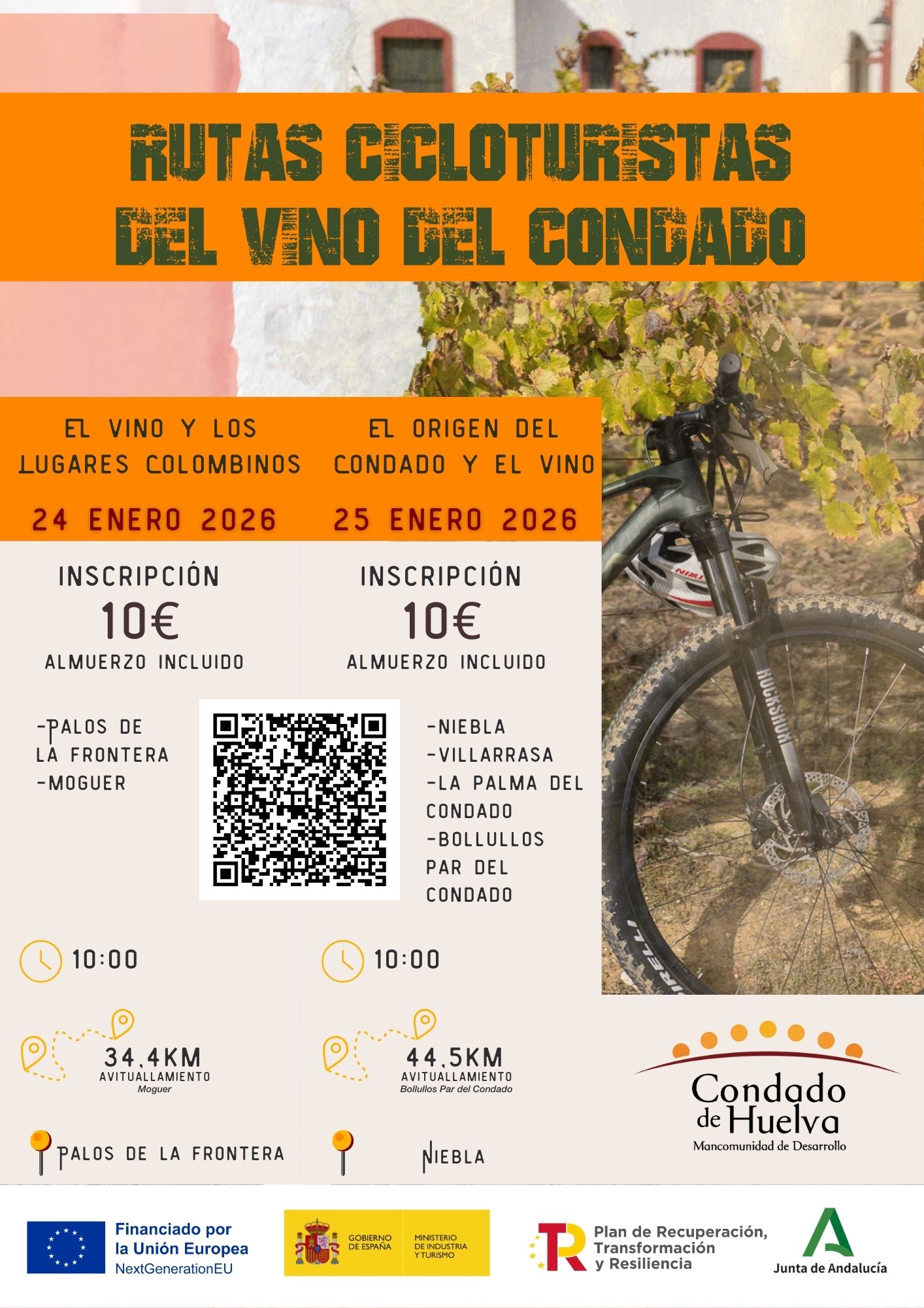 La ruta El Vino y los Lugares Colombinos partirá el día 24 de enero desde Palos de la Frontera, con un recorrido de 34,4 kilómetros y paso por Moguer; mientras que El Origen del Condado y el Vino tendrá su salida el día 25 de enero en Niebla, con un itinerario de 44,5 kilómetros que recorrerá Villarrasa, La Palma del Condado y Bollullos Par del Condado. Ambas rutas, que tienen las inscripciones ya abiertas por un precio de 10 euros, comenzarán a las 10:00 horas y cuentan con avituallamiento y almuerzo incluido, La tercera ruta, Doñana y el Vino, se celebrará durante el mes de febrero, y su información detallada se dará a conocer próximamente.
