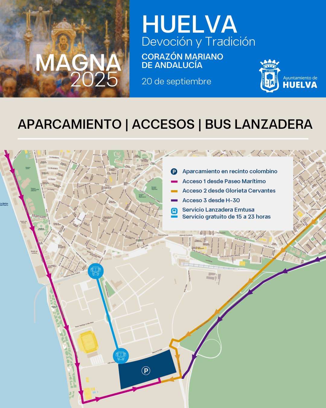 Con motivo de la Procesión Jubilar Magna Mariana, que se celebrará el sábado 20 de septiembre, el Ayuntamiento de Huelva ha puesto en marcha un amplio dispositivo especial de movilidad, seguridad y atención ciudadana para garantizar el correcto desarrollo del evento y facilitar la asistencia de miles de personas.