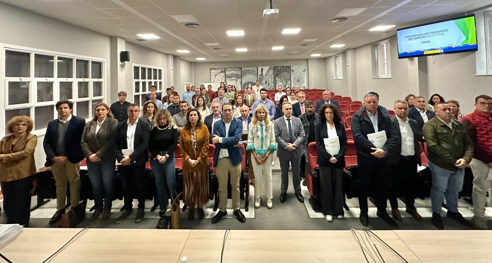 La subdelegada del Gobierno en Huelva, María José Rico, y el director provincial del Servicio Público de Empleo Estatal (SEPE), Antonio Alvarado, se reunieron hoy con representantes de los Plenos de 81 municipios de la provincia y el personal técnico de las Corporaciones en el salón de actos de la Facultad de la Merced de la Universidad de Huelva, para informar sobre la gestión y ejecución que compete al Gobierno de España en el Programa de Fomento del Empleo Agrario (PFEA).