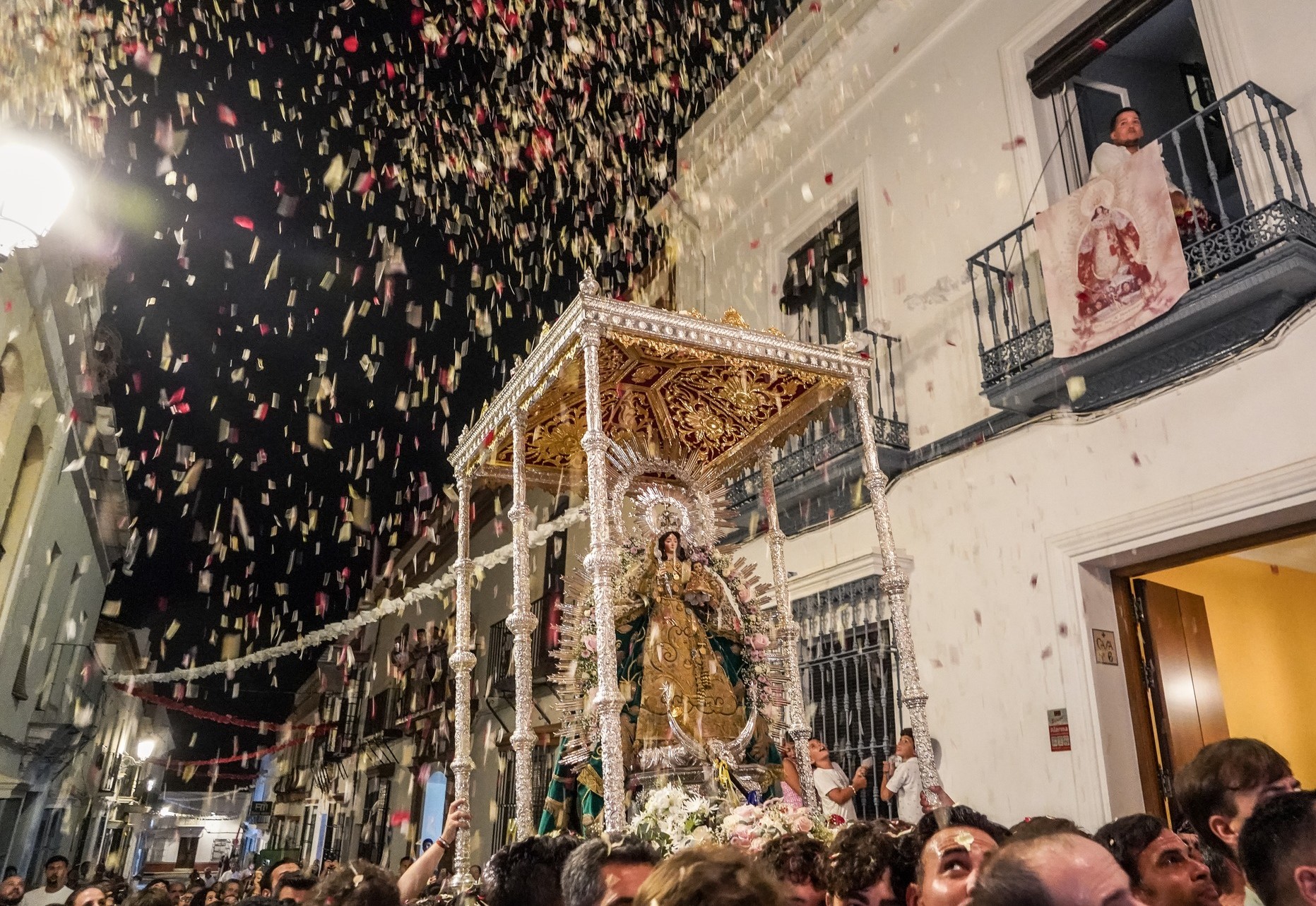 Triunfal recorrido hacia la parroquia por un Moguer lose fieles dieron la bienvenida a su Patrona con varias petaladas de flores, actuaciones de grupos musicales y solistas, vivas y encendidos piropos a Montemayor.