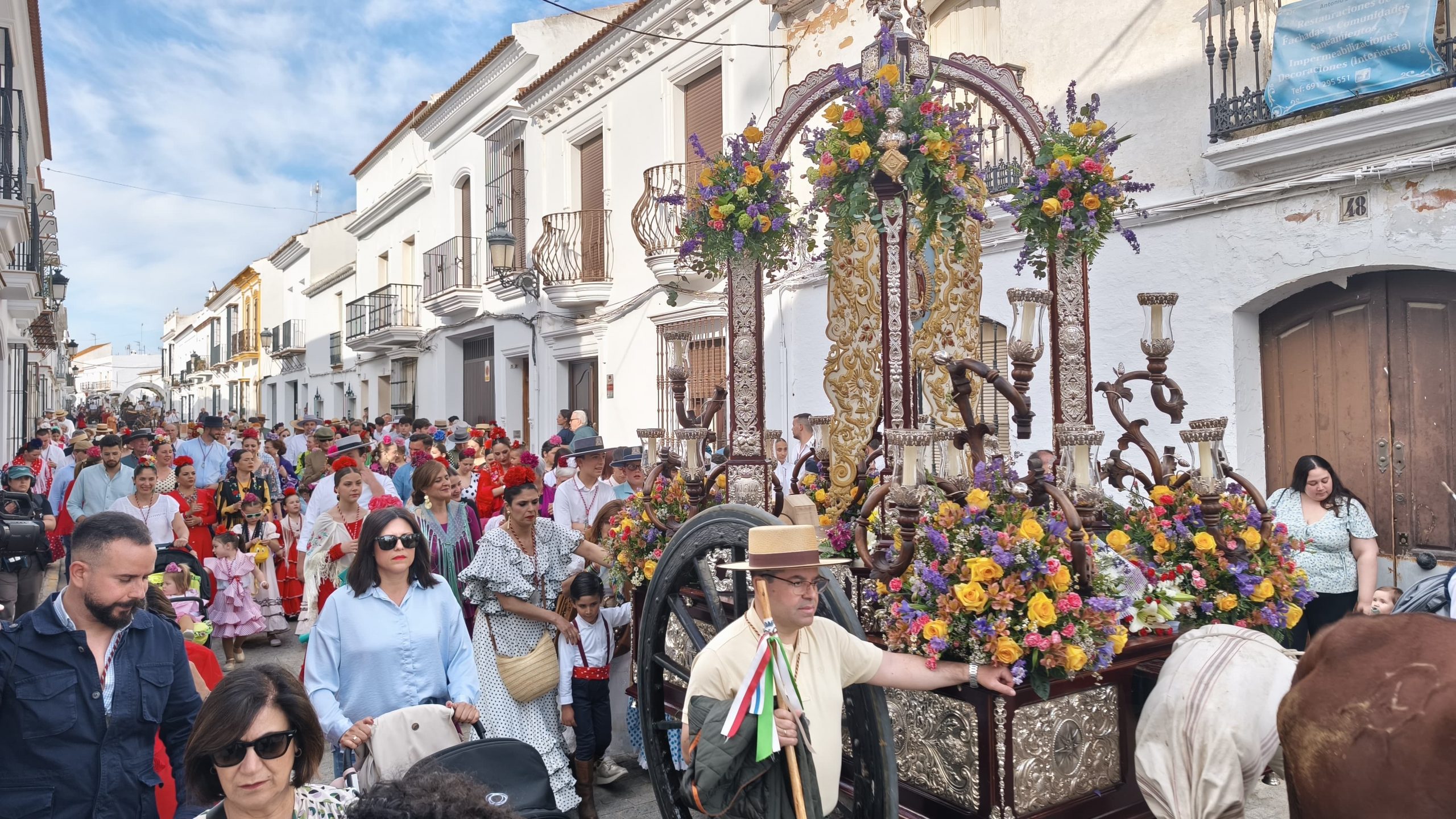 El párroco José Antonio Omist ha oficiado la misa de romeros junto a la casa-hermandad de la Matriz moguereña, iniciándose a continuación el recorrido de despedida por las calles de Moguer presidido por el Simpecado junto a cuyo carretón desfilan los mayordomos de la romería 2025, los hermanos Inés y Rafael Bogado.