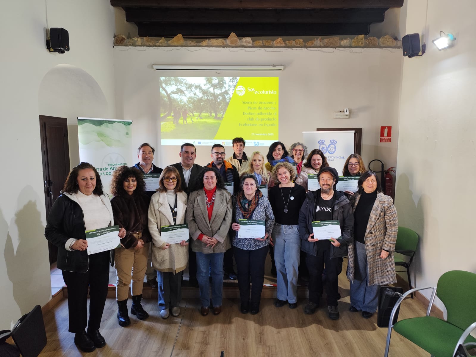 Nueve empresas turísticas de la Sierra de Aracena y Picos de Aroche han recibido oficialmente su acreditación como integrantes del club de producto Ecoturismo en España y de su marca ‘Soy Ecoturista’, tras superar el proceso de verificación y asesoramiento necesario para ello. Esta iniciativa se ha desarrollado en el marco del Plan de Sostenibilidad Turística en Destino (PSTD), ejecutado por la Diputación de Huelva y financiado por la Unión Europea a través de los fondos Next Generation EU y del Plan de Recuperación, Transformación y Resiliencia (PRTR).