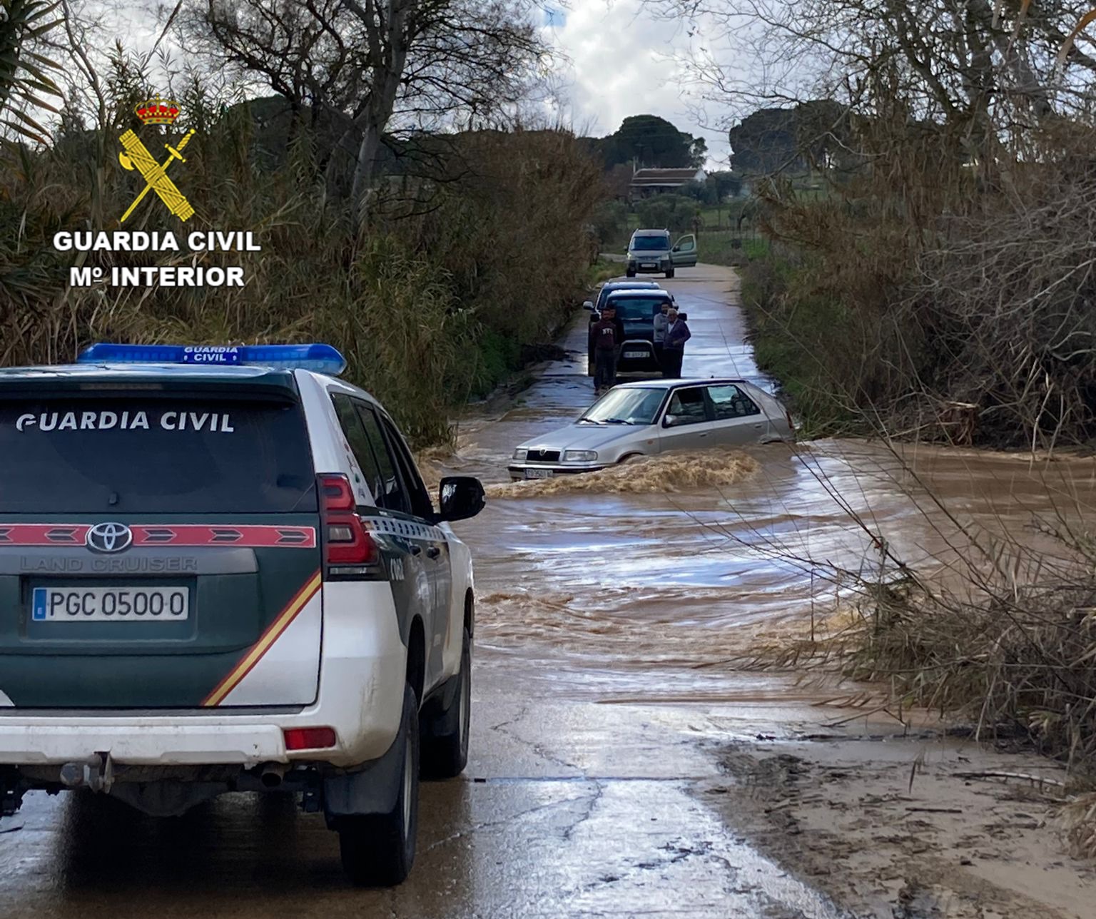 La Guardia Civil rescata a una persona atrapada en su coche por la crecida del arroyo Santa María de Almonte.