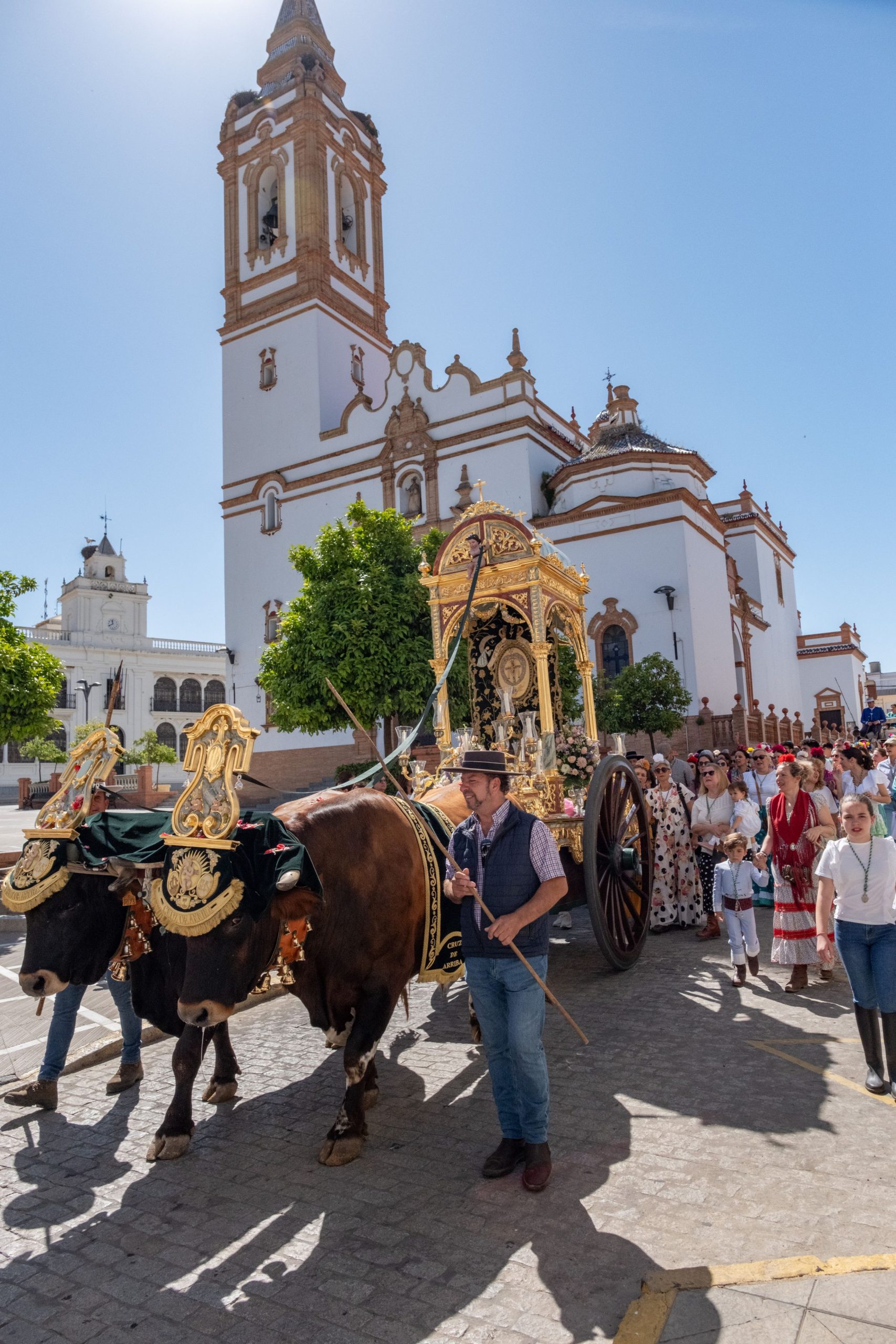 La jornada comenzará temprano, con la Banda Filarmónica Ciudad de Bollullos recogiendo a la hermana mayor, Toñi Calvo Castellano, para dar paso a la salida oficia, tras entronizar el estandarte que ha permanecido los últimos días en la casa de la hermana mayor, en la carreta tirada por bueyes. El «niño del romero» encabezará el cortejo, seguido de cientos de romeros que recorrerán las calles del municipio acompañando a la carreta con el estandarte, al ritmo de gaita y tamboril.
