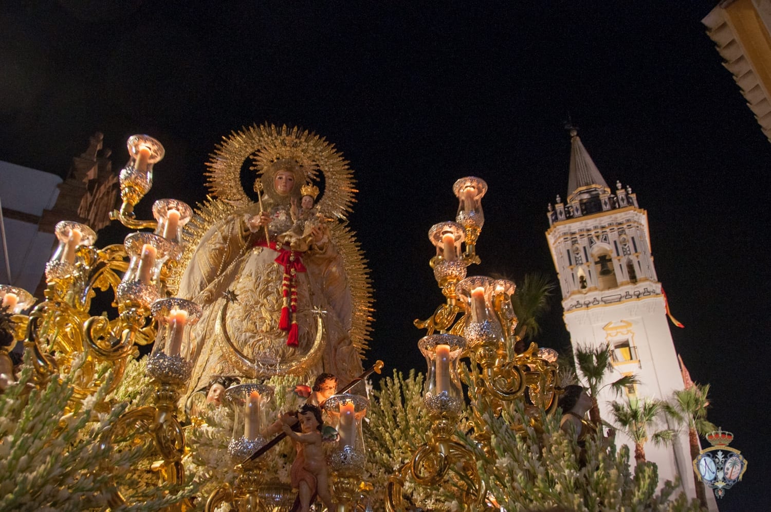 En Escacena, la Virgen de Luna se convierte en protagonista. Tras la Bajada del Presbiterio y la Función Principal al mediodía, la procesión tiene lugar a las 21:00 h. Miles de fieles acompañan a la imagen mariana en su recorrido por las calles, en una noche mágica que finaliza con fuegos artificiales.
