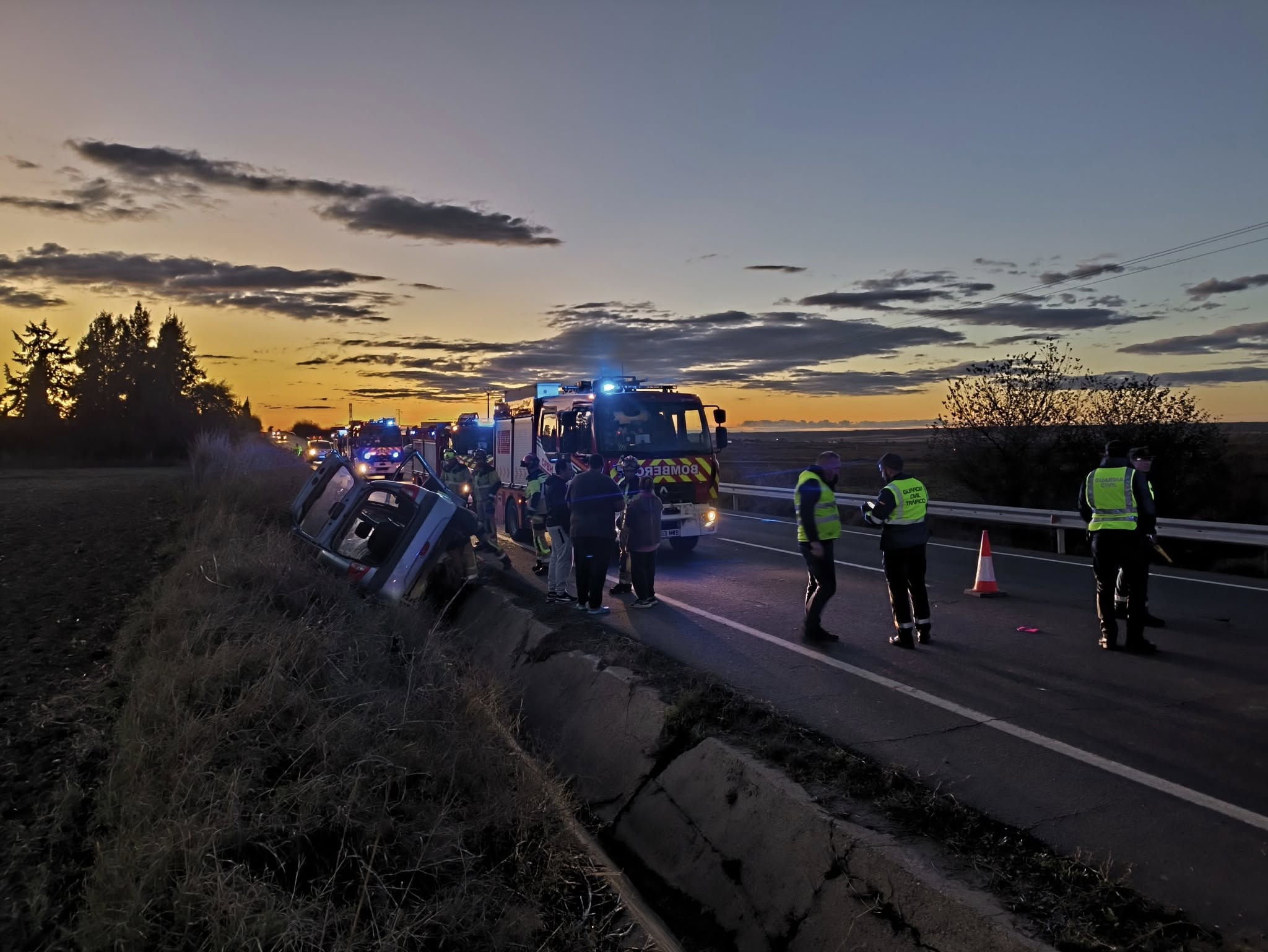 Hasta el lugar se desplazaron dotaciones de los parques de Almonte y San Juan del Puerto (BC3 y BC9), compuestas por ocho bomberos y cuatro vehículos. A su llegada, los equipos procedieron a estabilizar el turismo y llevaron a cabo la excarcelación de la conductora, que había quedado atrapada en su interior. Posteriormente, fue atendida por los servicios sanitarios desplazados a la zona.