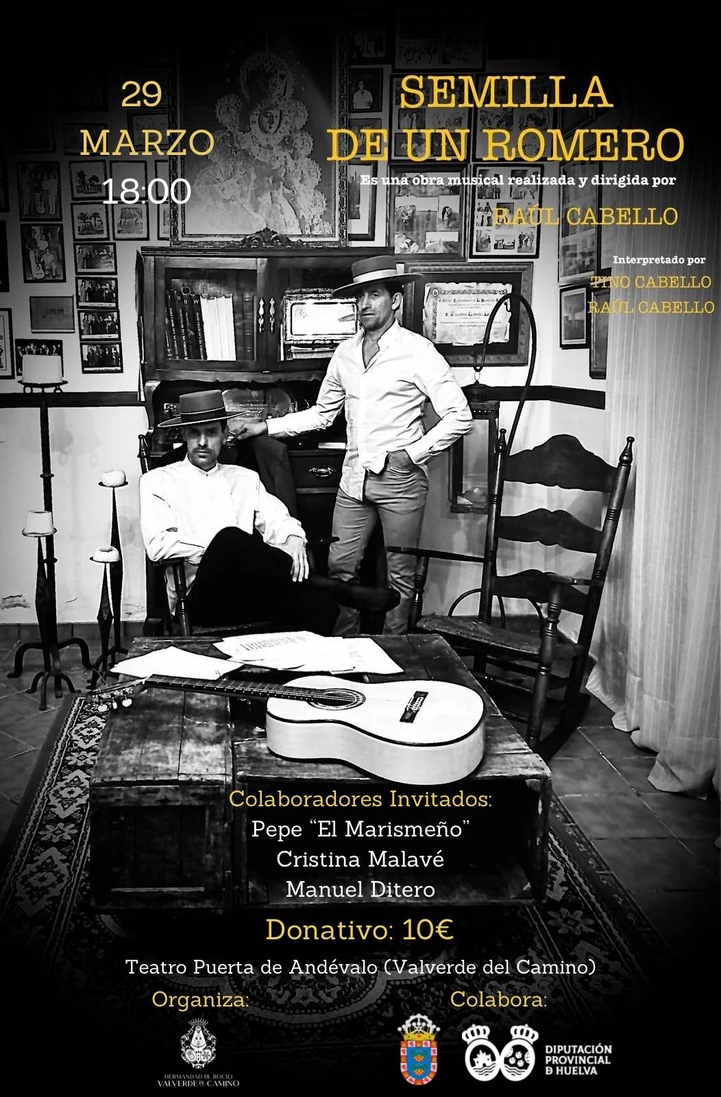 El próximo 29 de marzo, a las 18:00 horas, el Teatro Puerta de Andévalo de Valverde del Camino acogerá la presentación del espectáculo musical ‘Semilla de un romero’, una obra de Raúl Cabello, con la participación de los artistas Raúl y Tino Cabello -hijos de Faustino Cabello, integrante de Los Romeros de La Puebla-. El evento tiene como objetivo recaudar fondos para la conservación del patrimonio de la Hermandad del Rocío de Valverde del Camino, por lo que la entrada al espectáculo es un donativo de 10 euros.