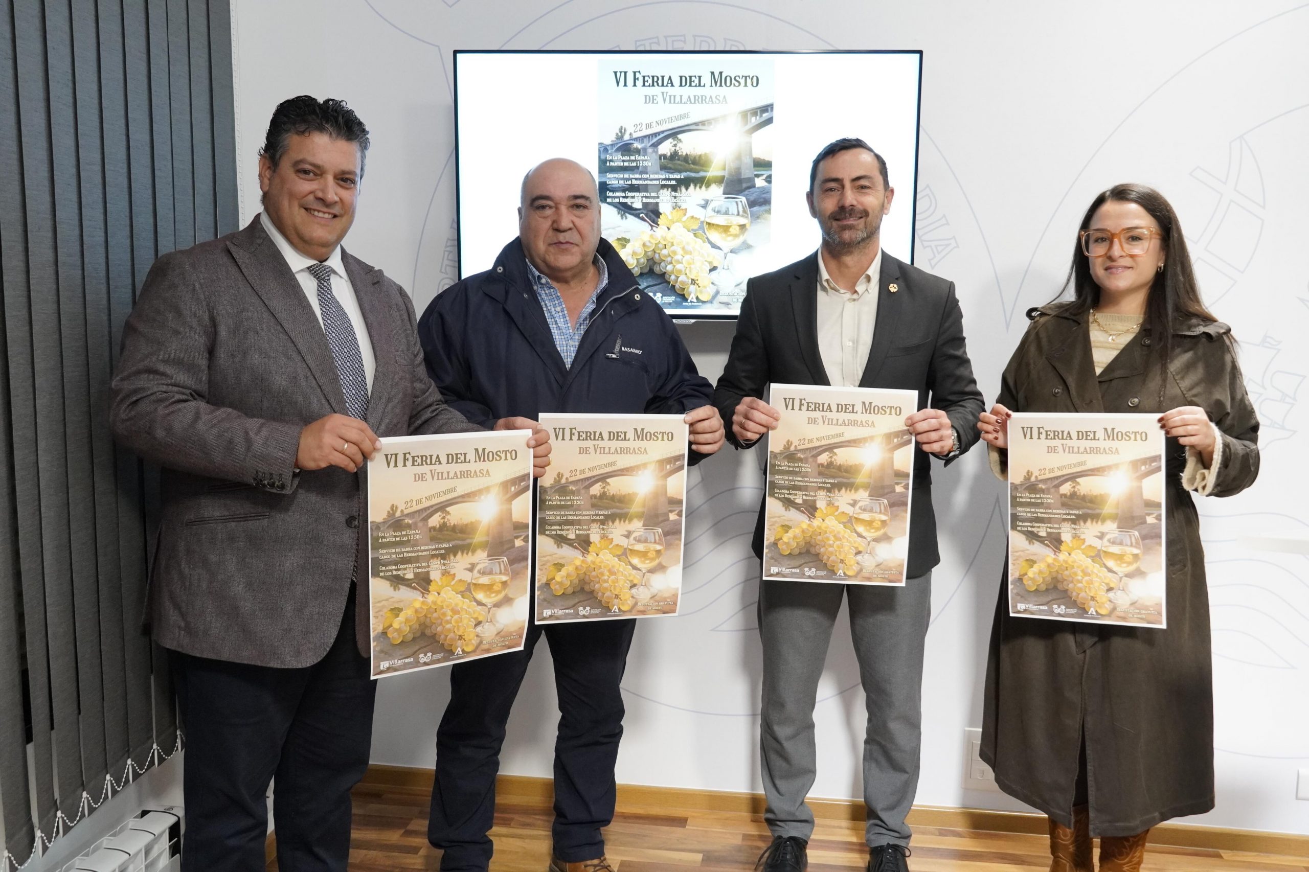 El municipio de Villarrasa celebrará el próximo 22 de noviembre la sexta edición de su Feria del Mosto, una cita que se consolida como una de las más esperadas del calendario otoñal en el Condado de Huelva. La presentación del evento ha tenido lugar hoy en la Diputación de Huelva, con la presencia del diputado provincial Juan Daniel Romero; el alcalde de Villarrasa y diputado de Medio Ambiente, Arturo Alpresa; el presidente de la Cooperativa del Campo Nuestra Señora de los Remedios, José Iglesias; y la concejala de Festejos y Deportes del Ayuntamiento de Villarrasa, Estefanía Martín.